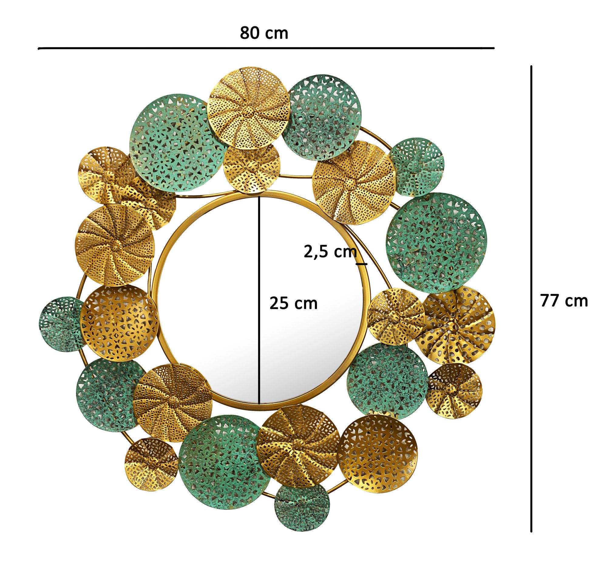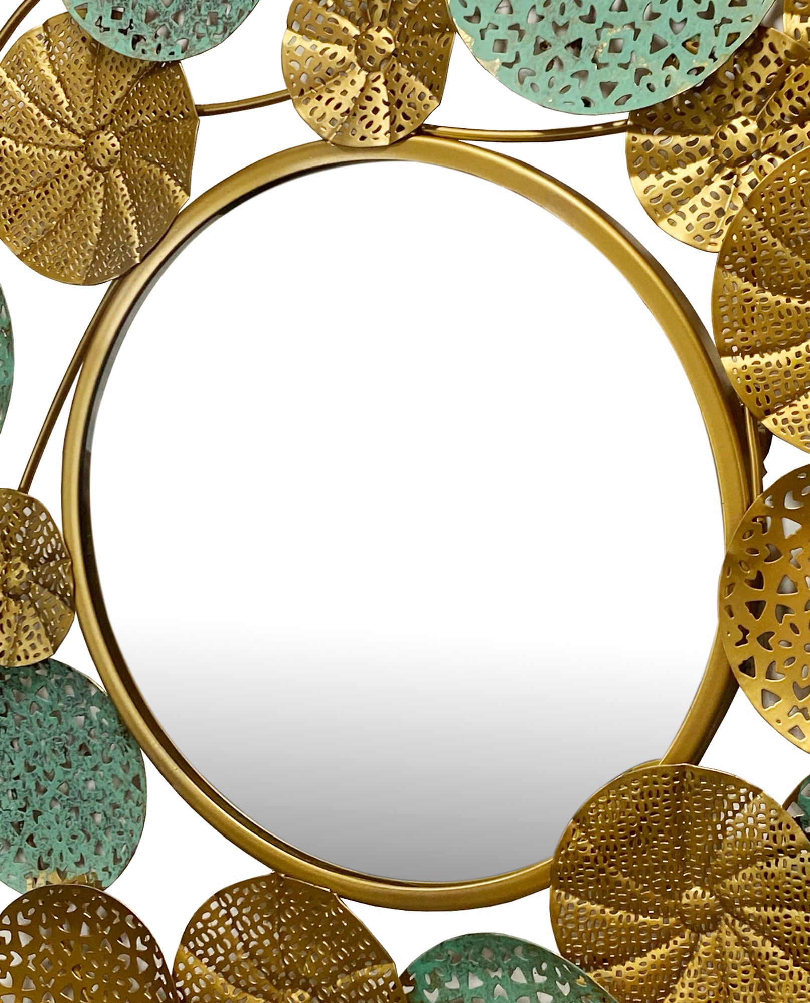 Kulaté nástěnné zrcadlo sklo a patinovaný zlatý železný rám | 80x77 cm | Zlatý rám s zelenou patinou