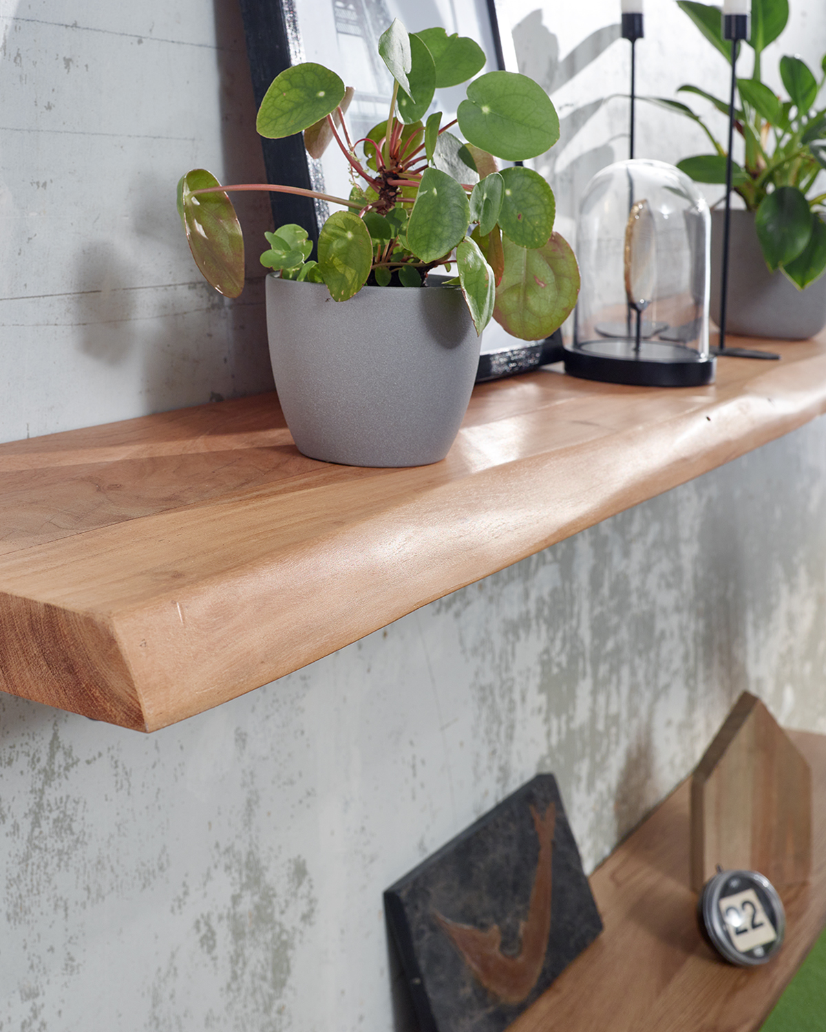 Ručně vyrobená, každá police je unikátní s přirozenými barevnými a texturálními odchylkami, které dodávají prostoru teplý charakter. Předvrtané otvory usnadňují montáž a umožňují efekt plovoucí poličky bez viditelných držáků.