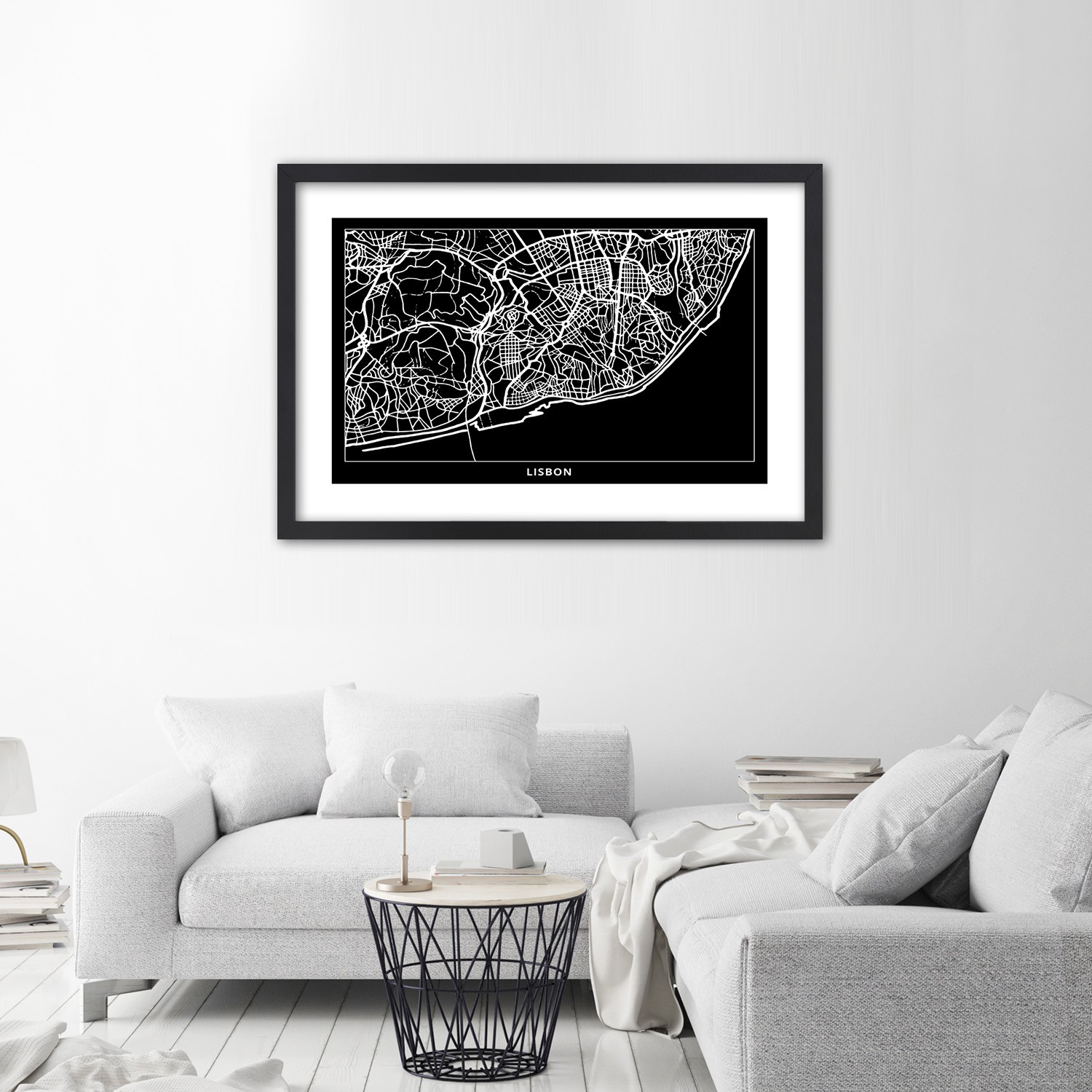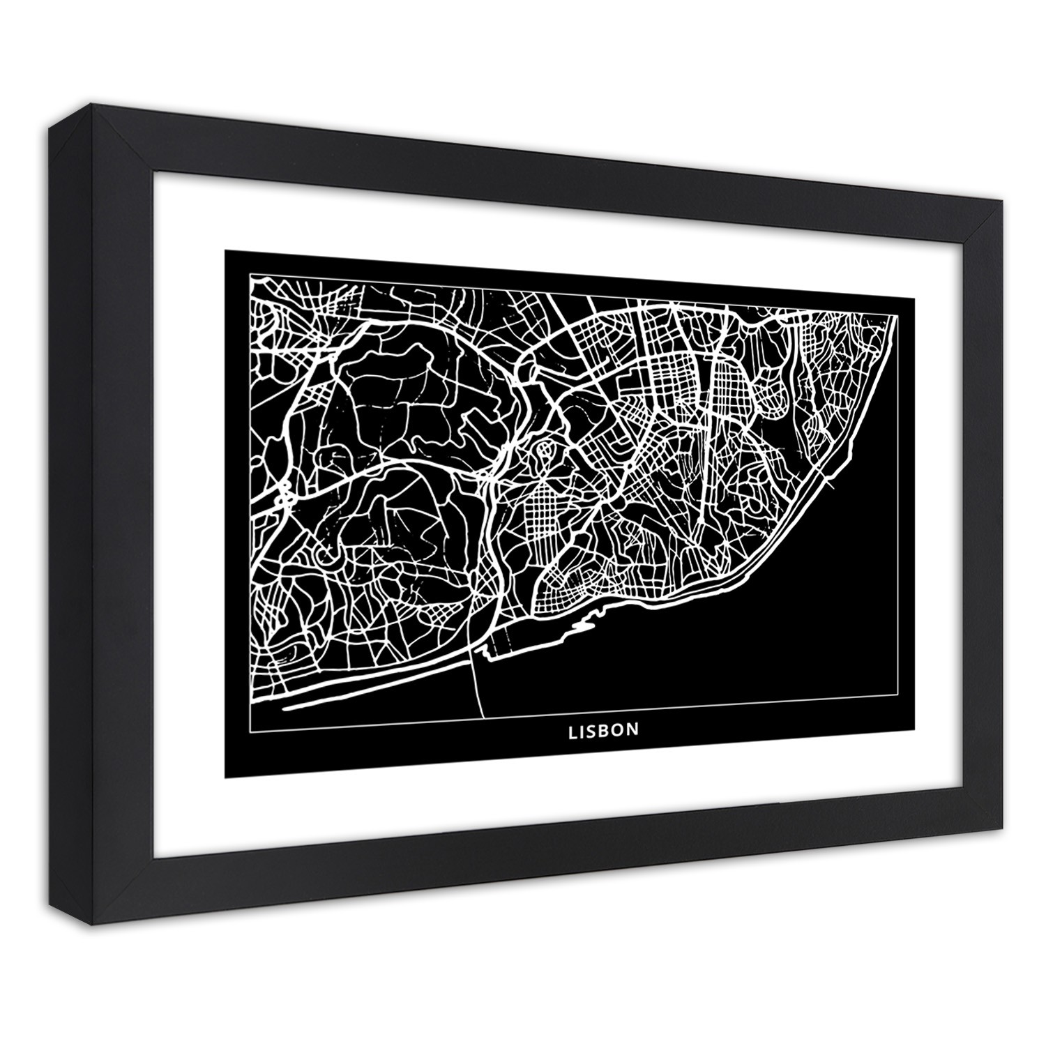 Černobílý rám s potištěným plátnem vyrobený z mdf sestávající z lisabonské mapy