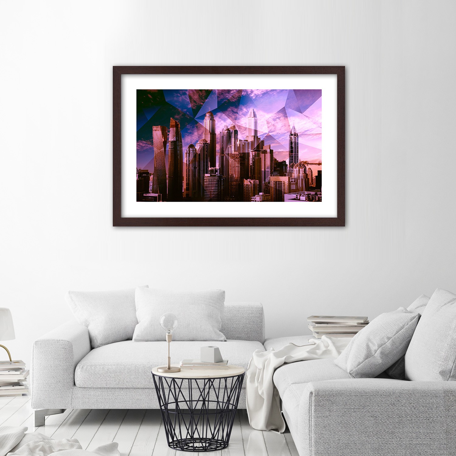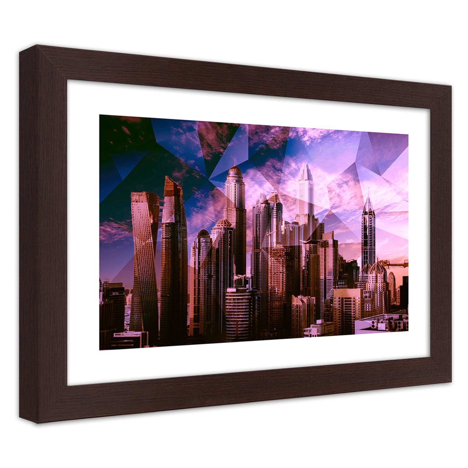 Mdf rám s obrázkem města vytištěným na papíře s fialovým barevným povrchem