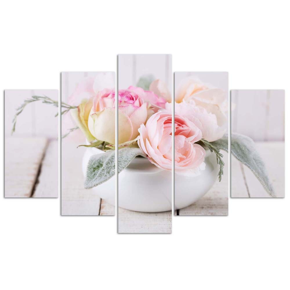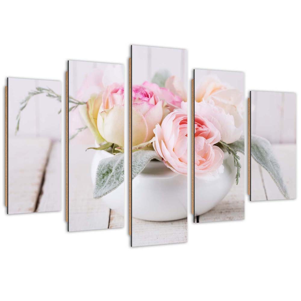 - Rám složený z pěti kusů „růží v bílé váze“ vytištěných na plátně MDF (medium density fiber).
