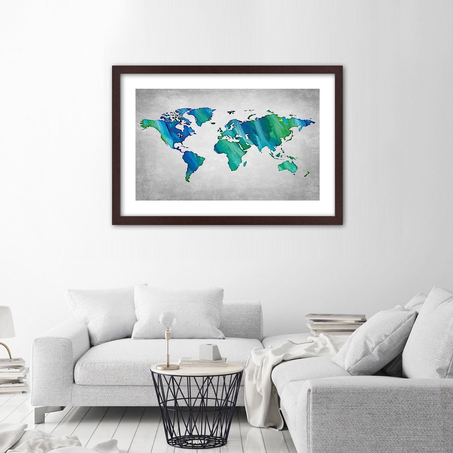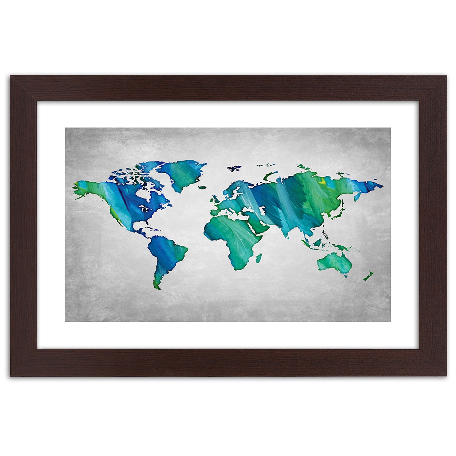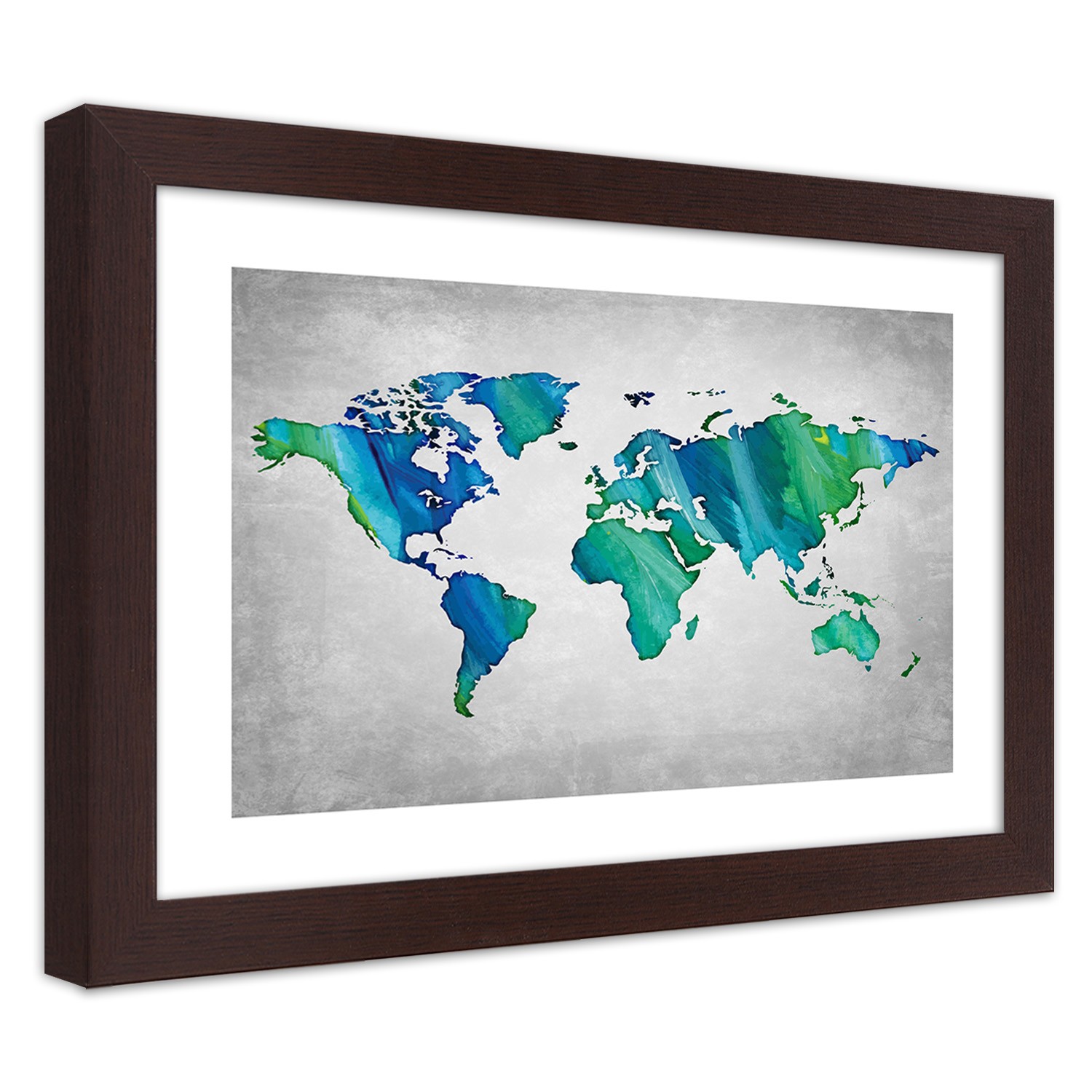 - Rám „Barevná mapa světa na pozadí imitace betonu“ vytištěný na saténovém papíře s rámem z MDF (vlákno střední hustoty).