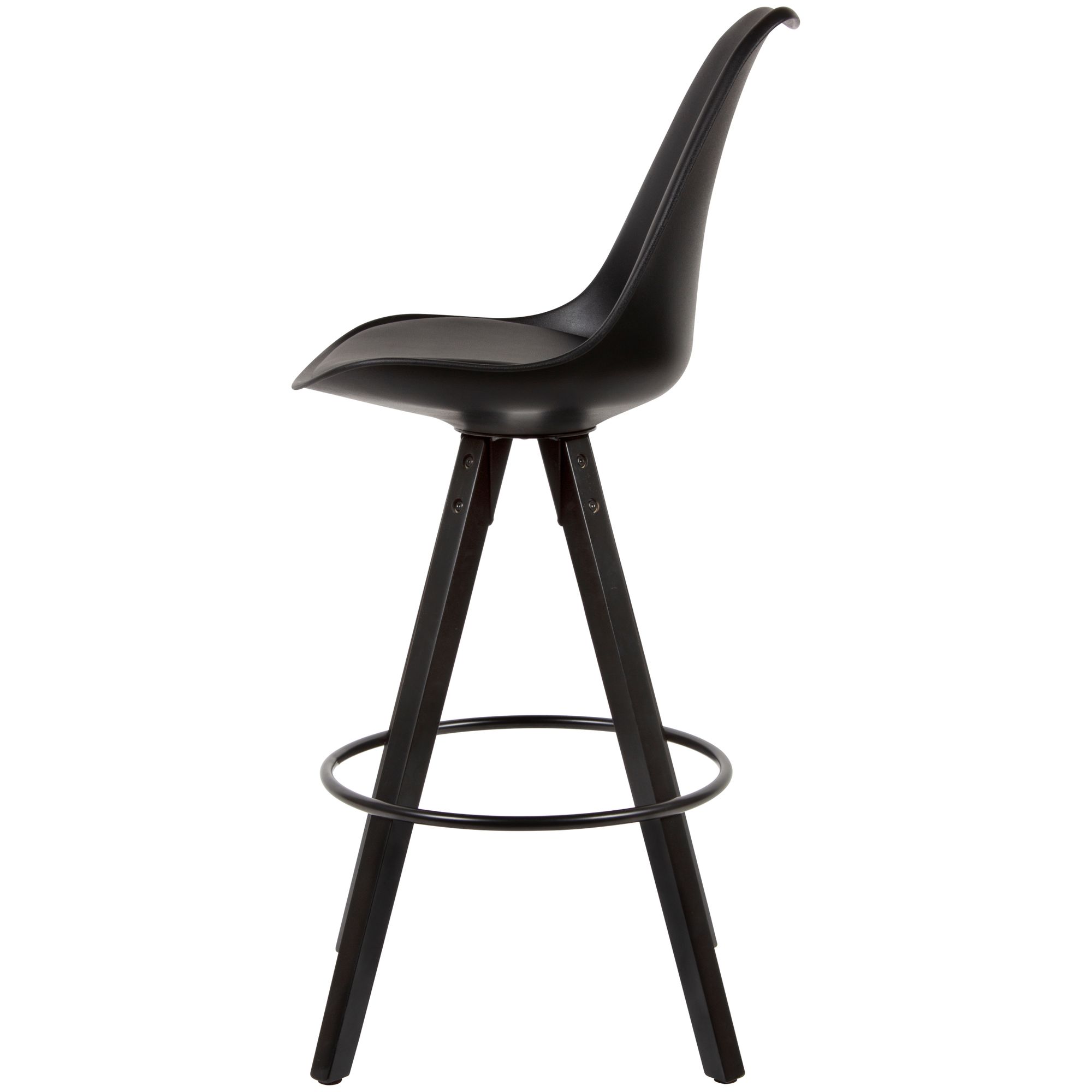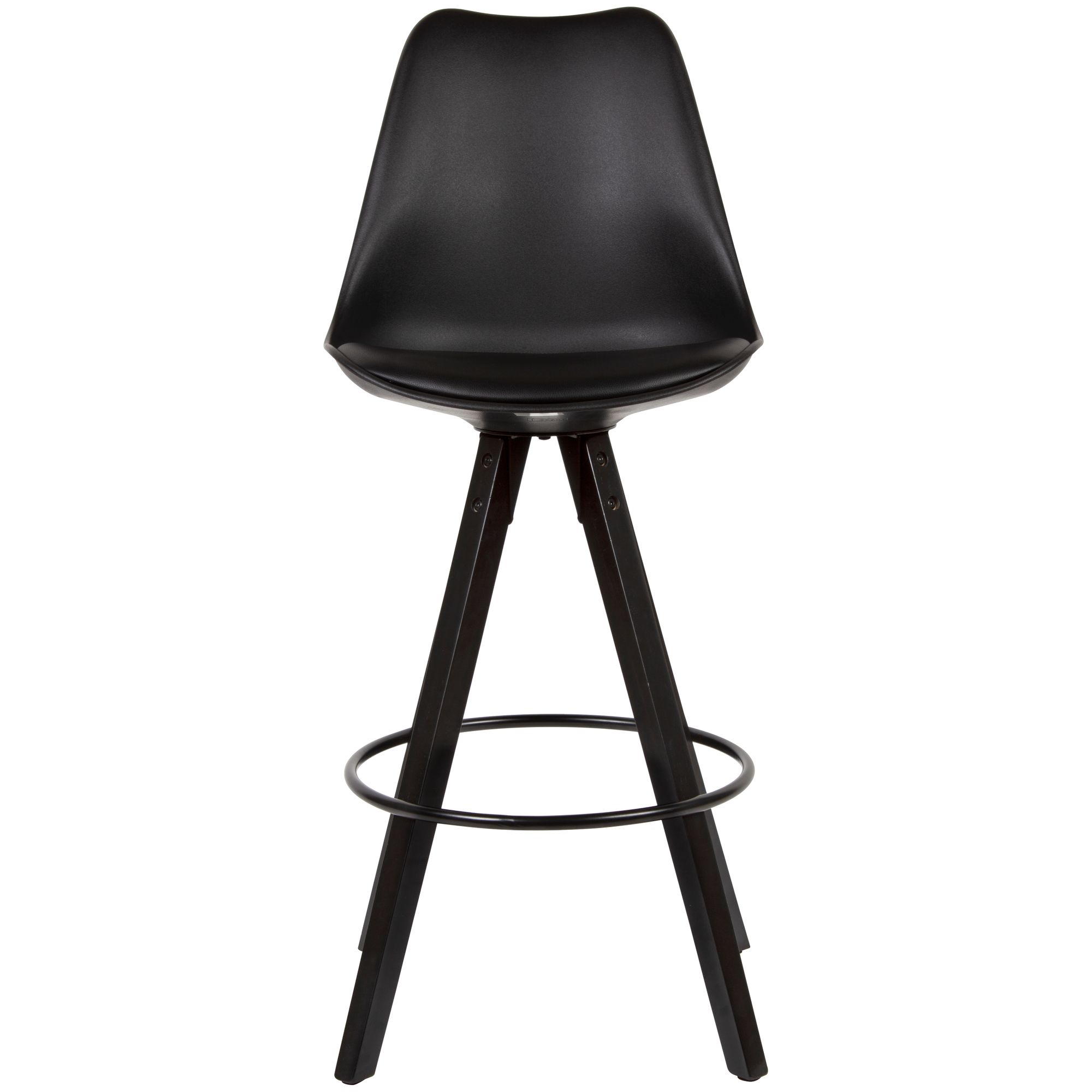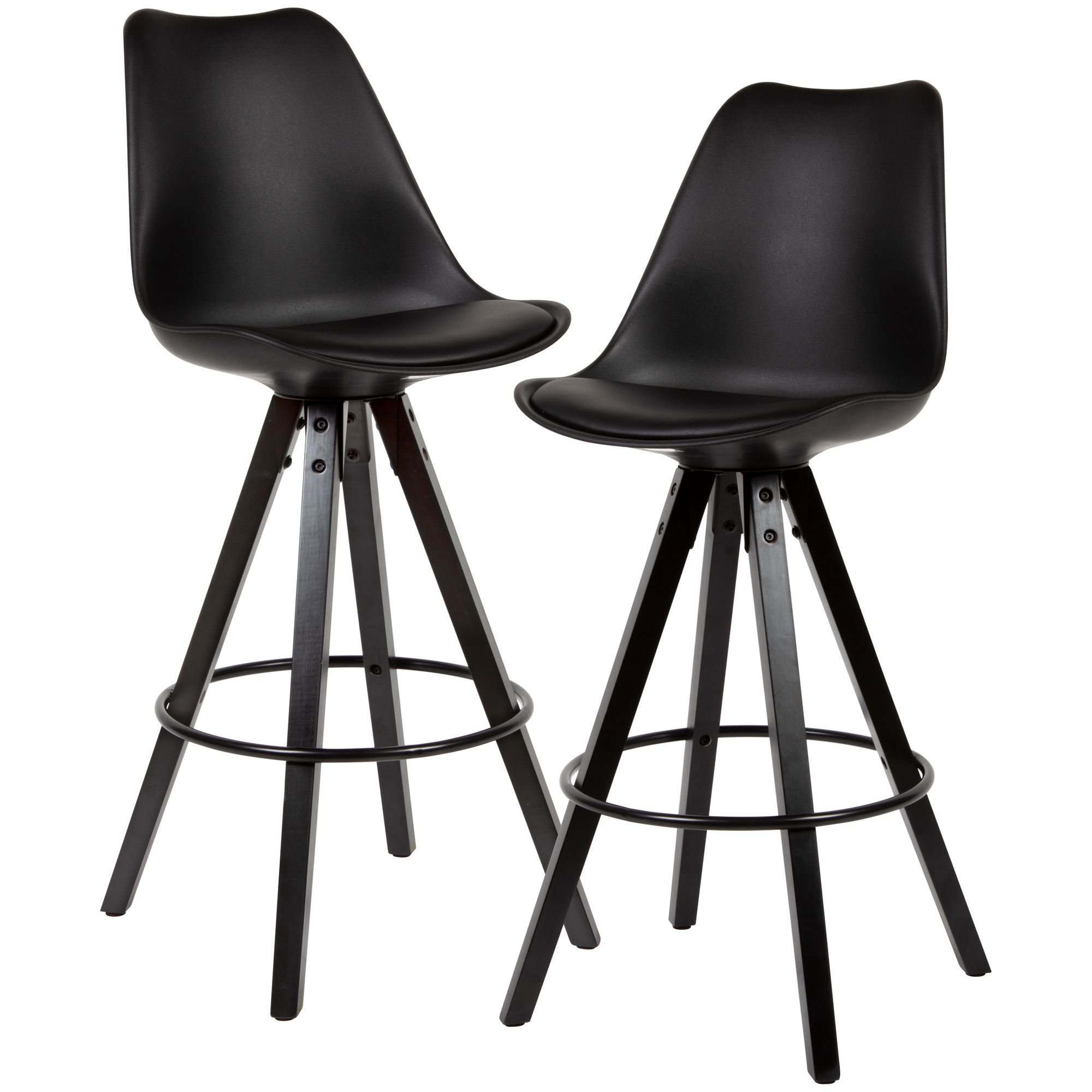 Add a modern touch to your bar with this 2-piece set of black bar stools in Scandinavian design. The generously padded seat and backrest are upholstered in faux leather for superior comfort. Solid black lacquered Hevea wood legs are complemented by a metal ring footrest at 30 cm height. Outward-angled legs provide firm stability, and felt glides prevent floor scratches.