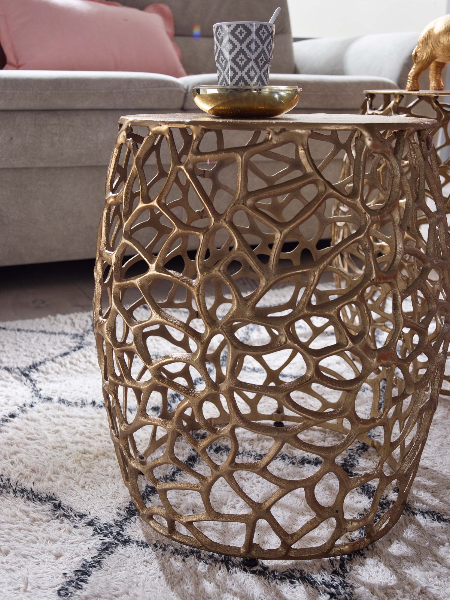 Add a touch of modern elegance to your home with this 2-piece gold aluminum side table set. Each table features a handcrafted branch-structure metal frame, creating unique decorative pieces that stand out.