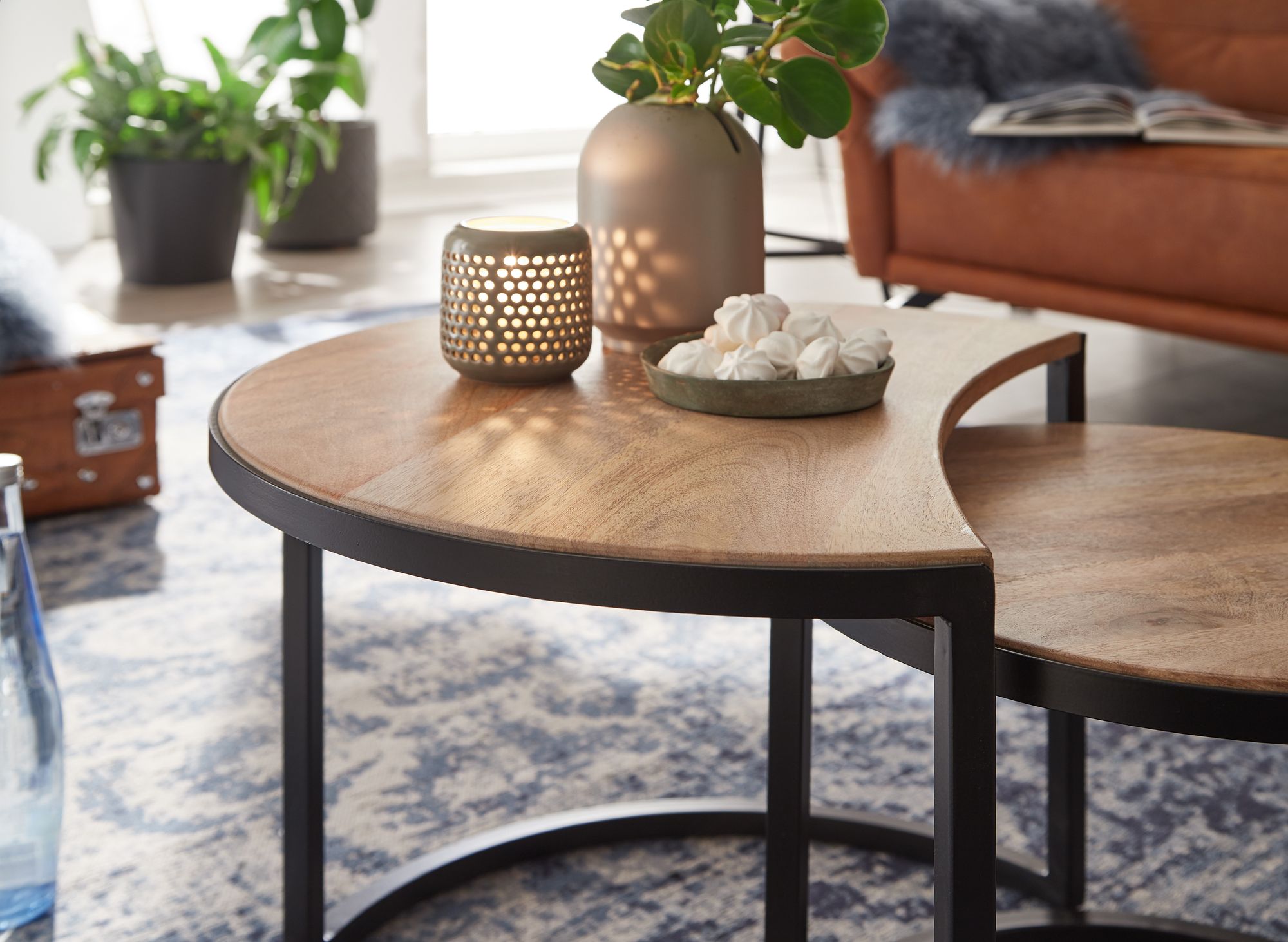 Discover this set of 2 round coffee tables in industrial style, perfectly combining the charm of light mango solid wood with the durability of black metal. Each handcrafted table offers a unique and authentic piece of furniture for your living room, featuring practical dimensions and clean design.