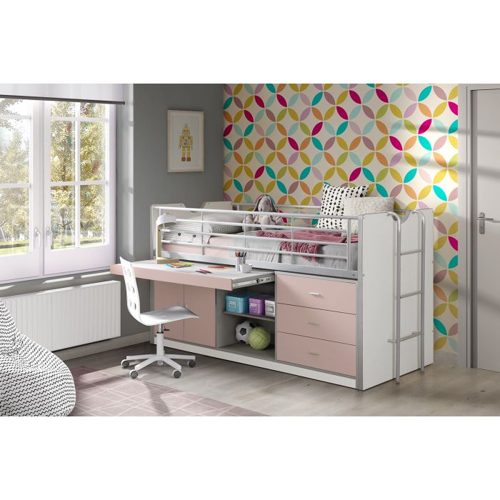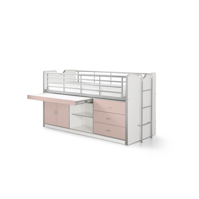 includes a slatted base. Under the bed there is a desk that can be pulled out,