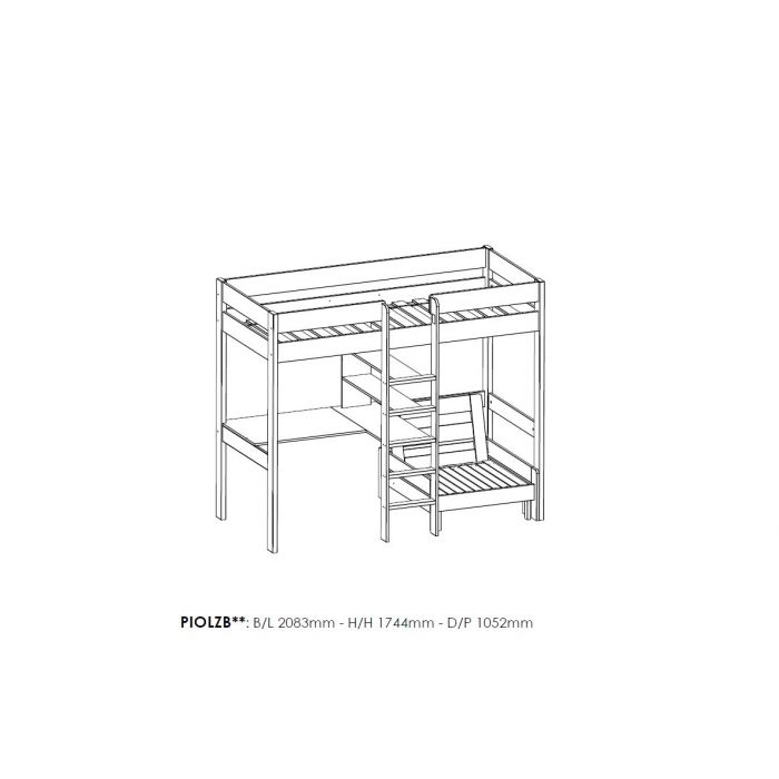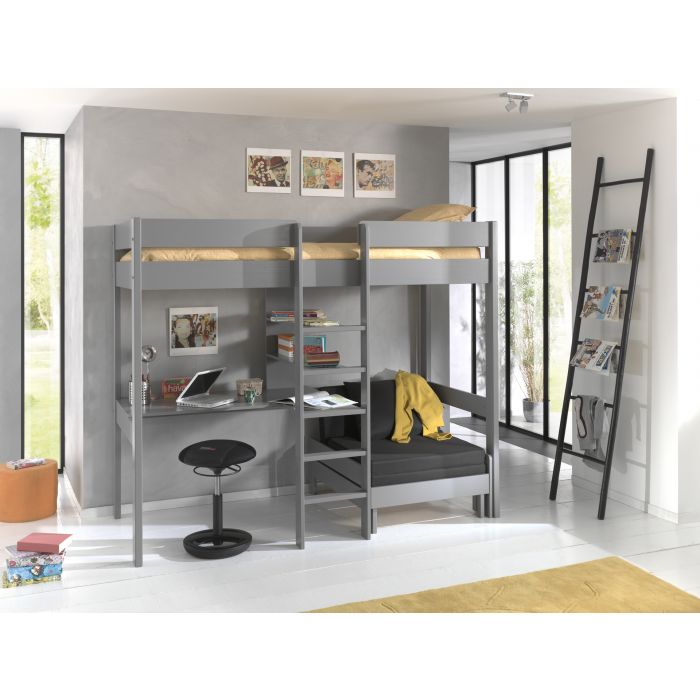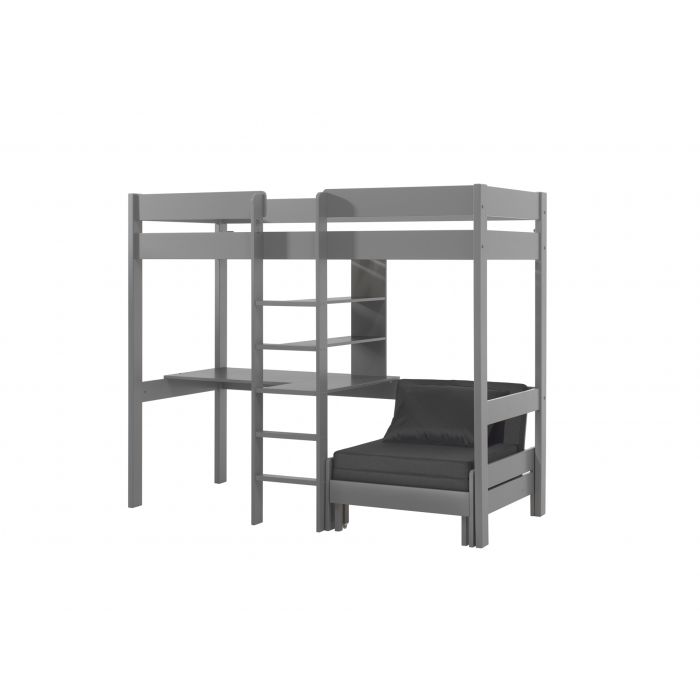 This PINO high sleeper in gray with seat bed is made of solid scandinavian pine wood. The slatted base and mattress of the seat bed are included. The staircase is located in the middle of the bed. Under the bed there is a side with desk and on the other side the sofa bed. The position of the sofa bed and the desk can be exchanged. The slatted base of the bunk bed is also included and suitable for a 90x200cm mattress.