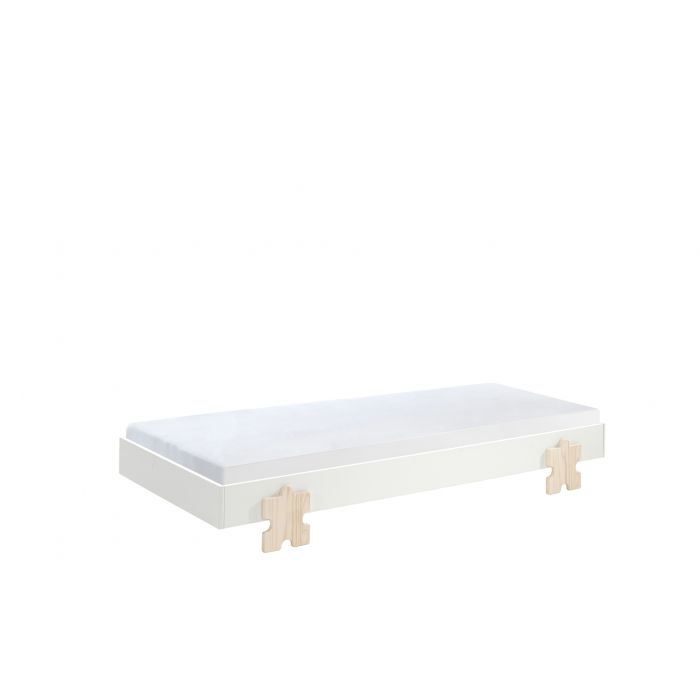 This extremely practical stackable bed from the MODULO collection is made of a combination of MDF and solid pine. The slatted base is included. If you have several beds, you can easily stack them to make room. The mattress can perfectly remain in the stacked beds. The solid puzzle legs make the bed super trendy!