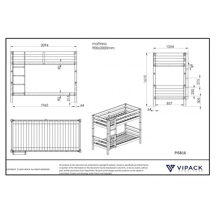 pine wood. The bed has a height of 160 cm. The ladder can be mounted on the