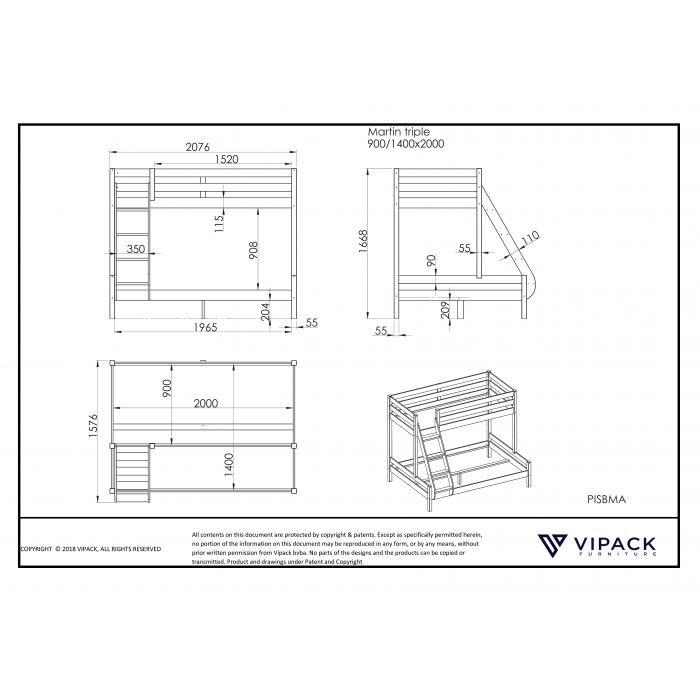 90 x 200 cm and the lower bed a width of 140 x 200 cm.