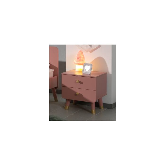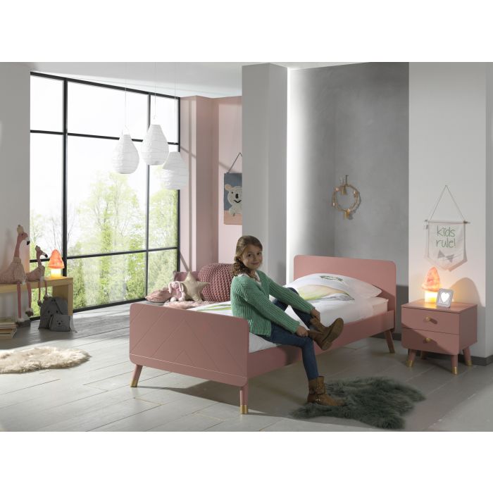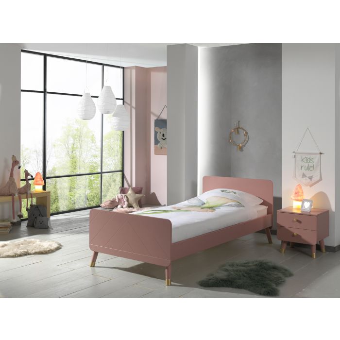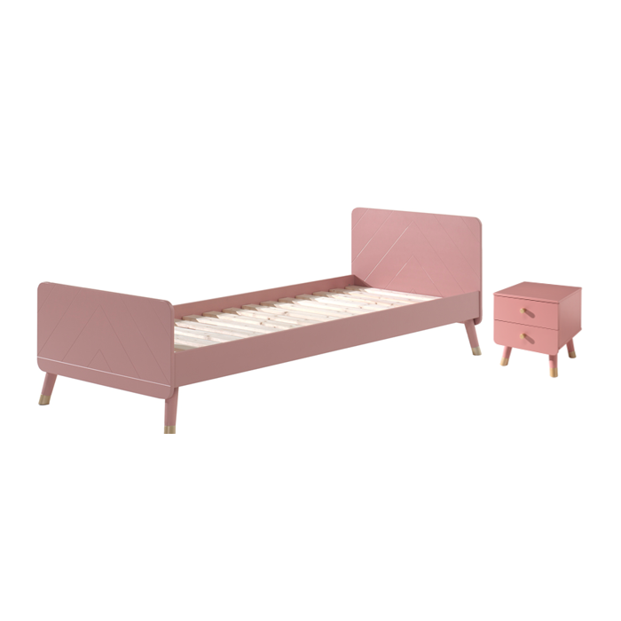 This single bed from BILLY is made of high quality MDF and is lacquered in the trend color terra pink. The bed is decorated on the headboard and footboard with a graphic pattern, which gives this bed a unique look. The gold-colored legs emphasize the retro character. The BILLY nightstand is the perfect finishing touch for any bedroom! This combination will fit perfectly in a romantic or modern interior.