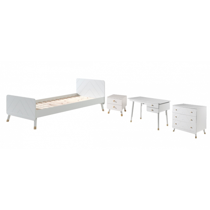 This single bed from BILLY is made of high quality MDF and is lacquered in white. The bed is decorated at the head and footboard with a graphic pattern, giving this bed a unique look. The gold-colored legs emphasize the retro character. The BILLY nightstand is the perfect finishing touch for any bedroom! The BILLY desk offers enough space to do homework. Thanks to the two drawers, writing and craft supplies also get a place. The dresser has 3 drawers that provide ample space for clothes or bedding. This combination will fit perfectly in a romantic or modern interior.