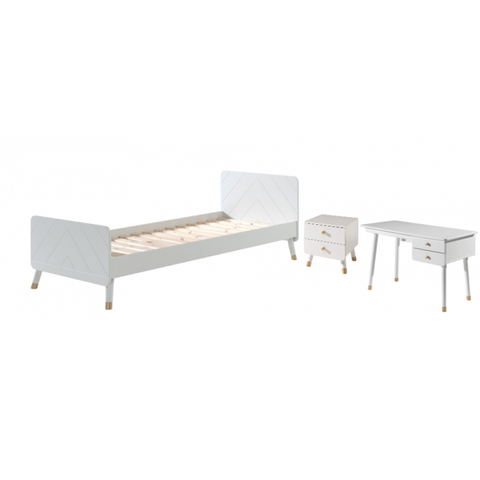 This single bed from BILLY is made of high quality MDF and is lacquered in white. The bed is decorated at the head and footboard with a graphic pattern, giving this bed a unique look. The gold-colored legs emphasize the retro character. The BILLY nightstand is the perfect finishing touch for any bedroom! The BILLY desk offers enough space to do homework. Thanks to the two drawers, writing and craft supplies will also have a place. This combination will fit perfectly in a romantic or modern interior.