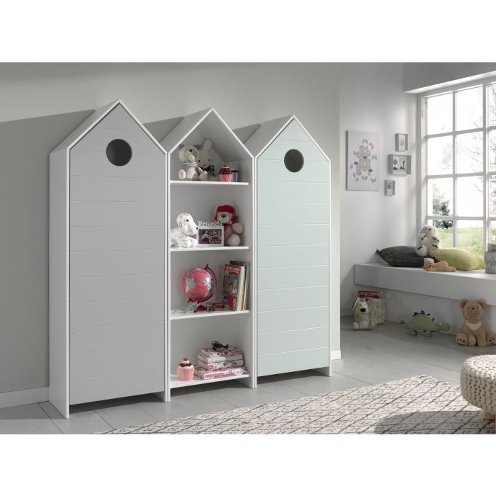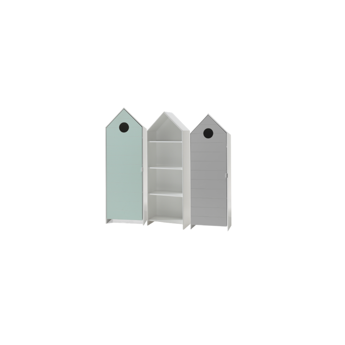 The CASAMI beach house cupboards will add colour to your kids bedroom. They are also compatible with other items from our collections. The closets with doors in mint green and cool grey have 3 shelves and 1 hanging rail. The open closet in white has also 3 shelves. There's plenty of storage space to keep your clothes folded our to display your books and toys.