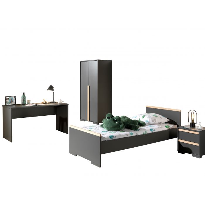 The LONDON bed (90x200) in anthracite has a Scandinavian look in combination with the solid pine. The nightstand in white has 2 drawers with soft-close system. The 2 door wardrobe consist of 2 doors with 2 shelves and 1 hanging rail. The desk has a spacious worktop. The perfect stylish addition for every children's or young adult's room.