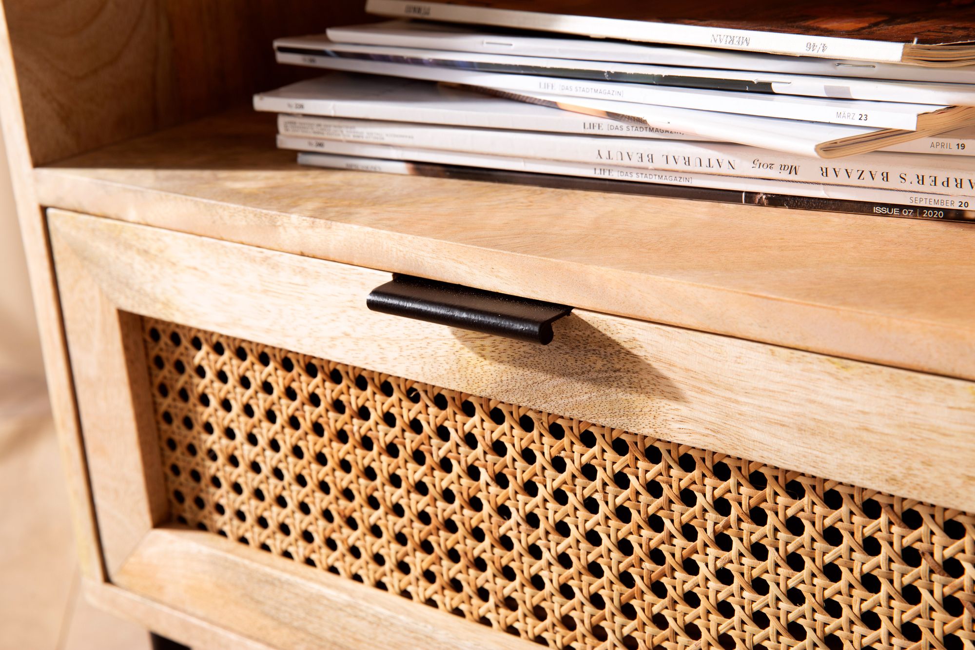 Tato moderní noční konzole kombinuje teplo masivního manga dřeva, eleganci tkaného ratanu a pevnost černé kovové konstrukce. Nabízí praktické úložné prostory díky zásuvce s ratanovým čelem a otevřenému přihrádkovému prostoru.