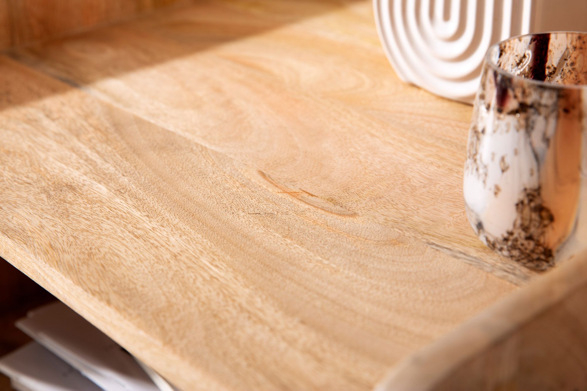 - Materiály: tělo z masivního manga dřeva (průhledný lak), čelo zásuvky z ratanu a MDF, nohy a úchyt z práškově lakovaného kovu