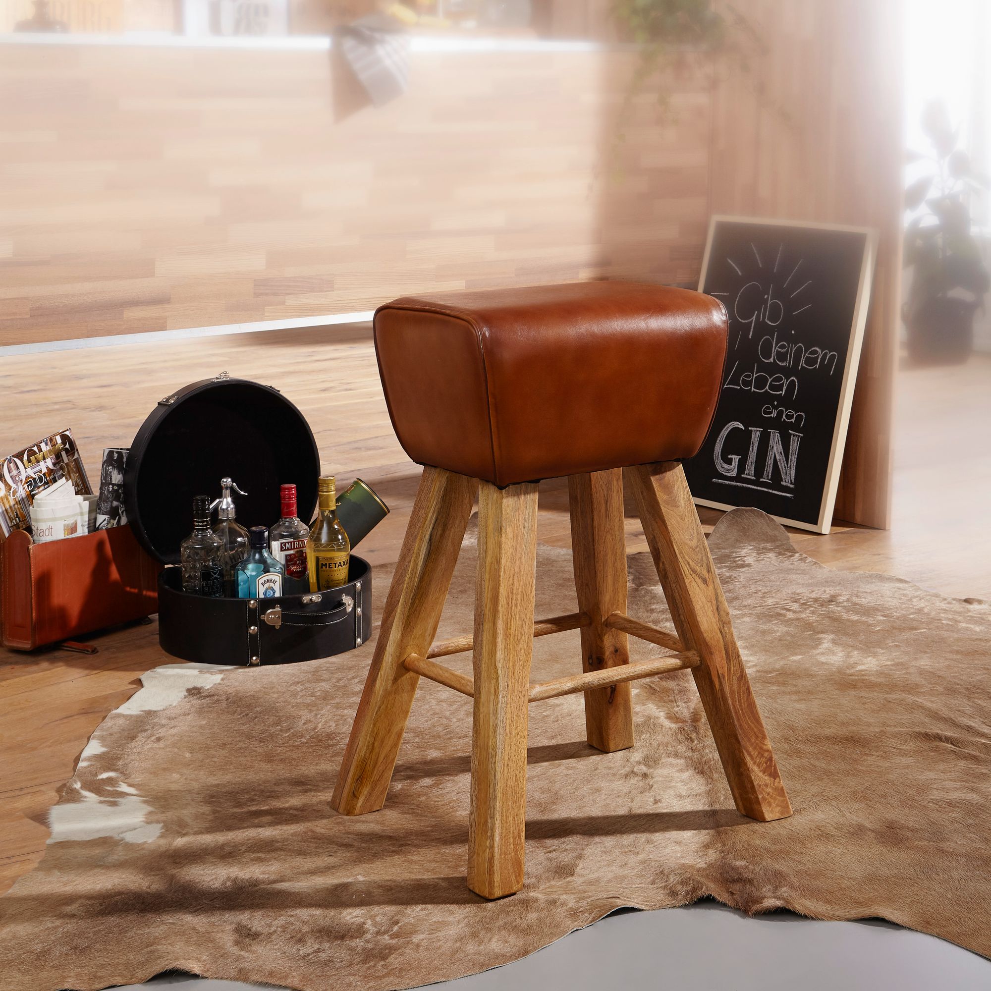 Barová stolička Country z manga dřeva a hnědé kůže | 43x75x43 cm