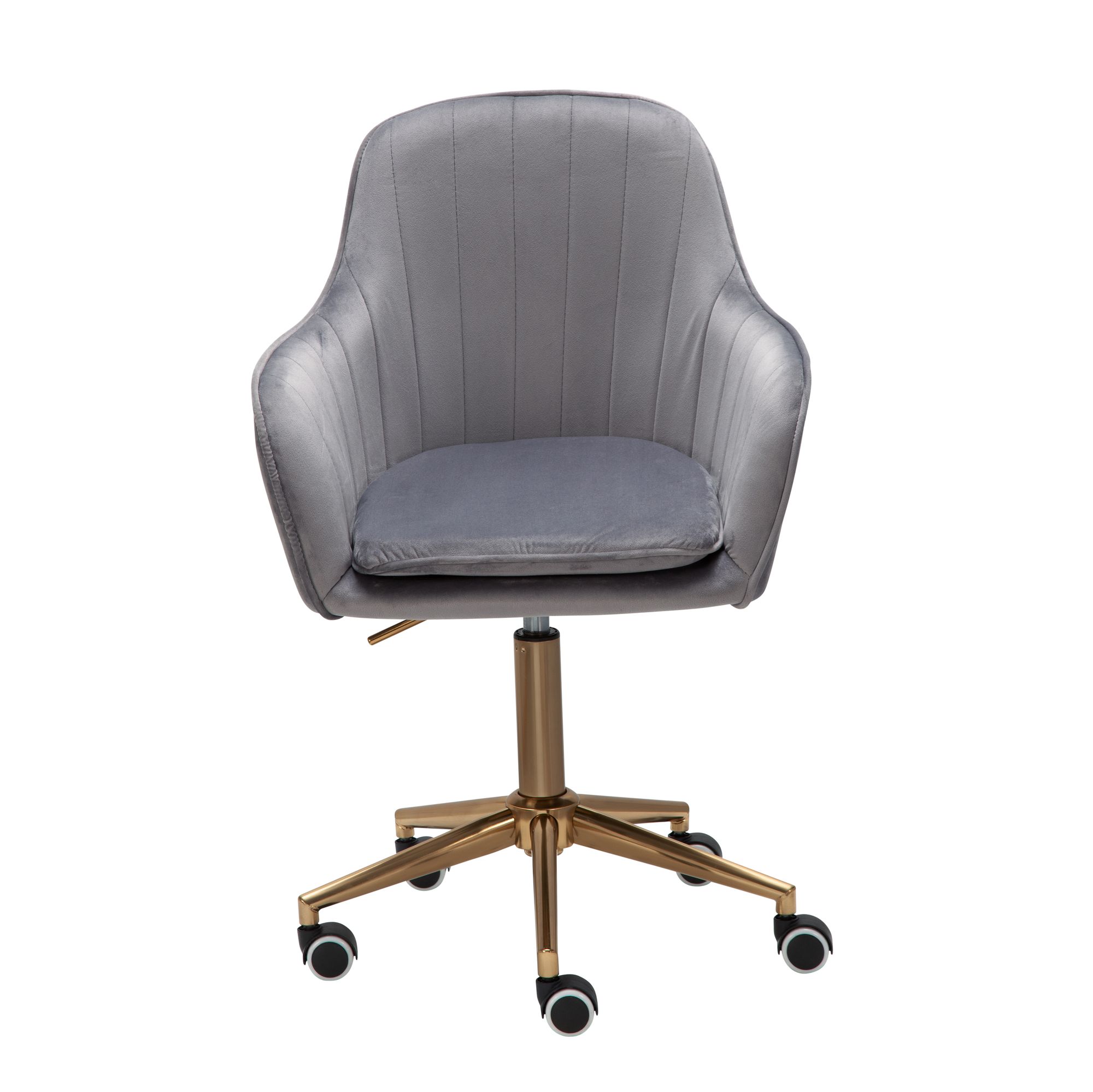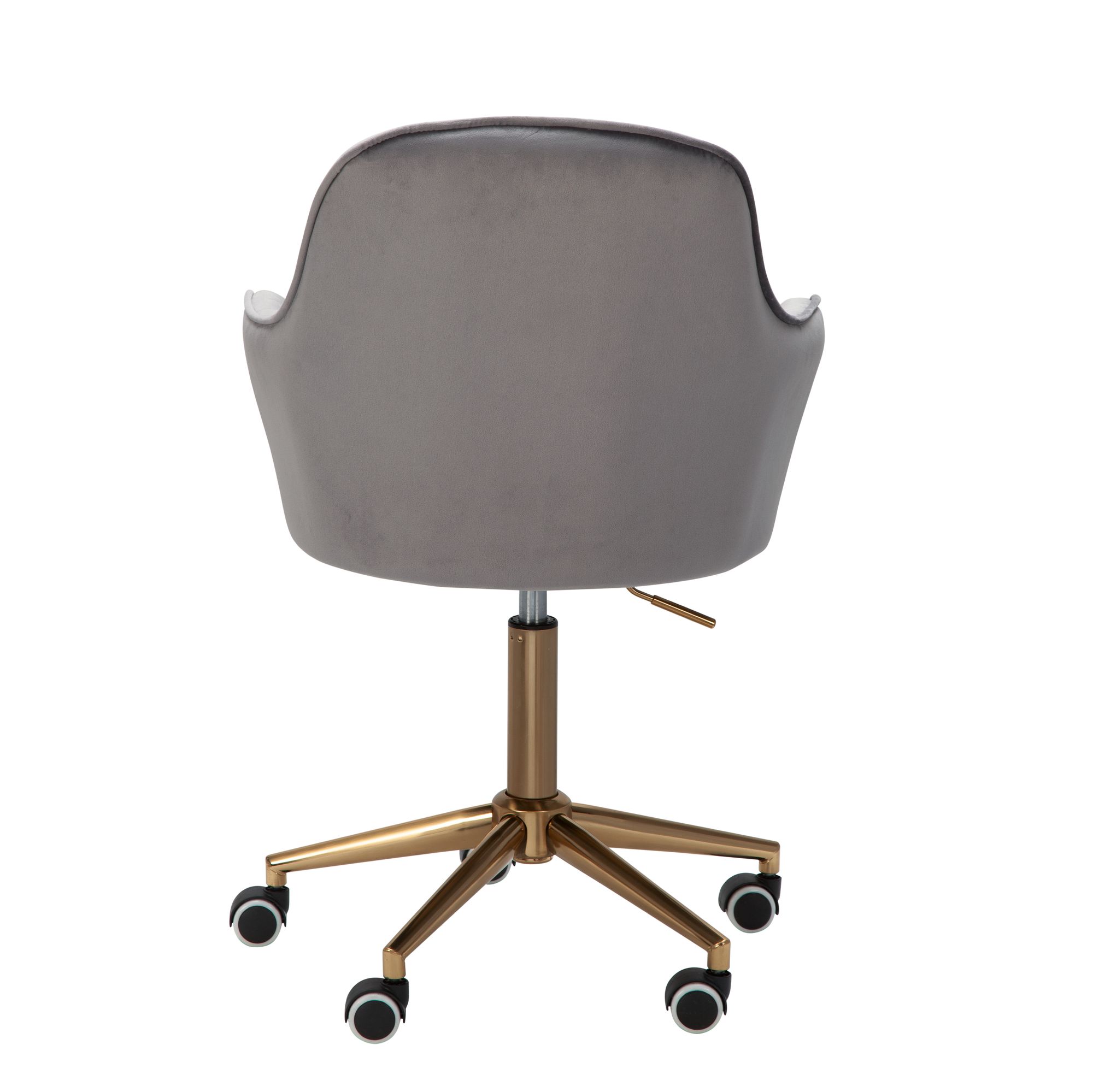 Moderní kancelářská židle z šedého sametu s ergonomicky tvarovanou skořepinou pro vyšší pohodlí. Zlatý kovový křížový podstavec dodává eleganci. Ideální do malých pracovních prostor, výškově nastavitelná (43-63 cm), nosnost až 120 kg.