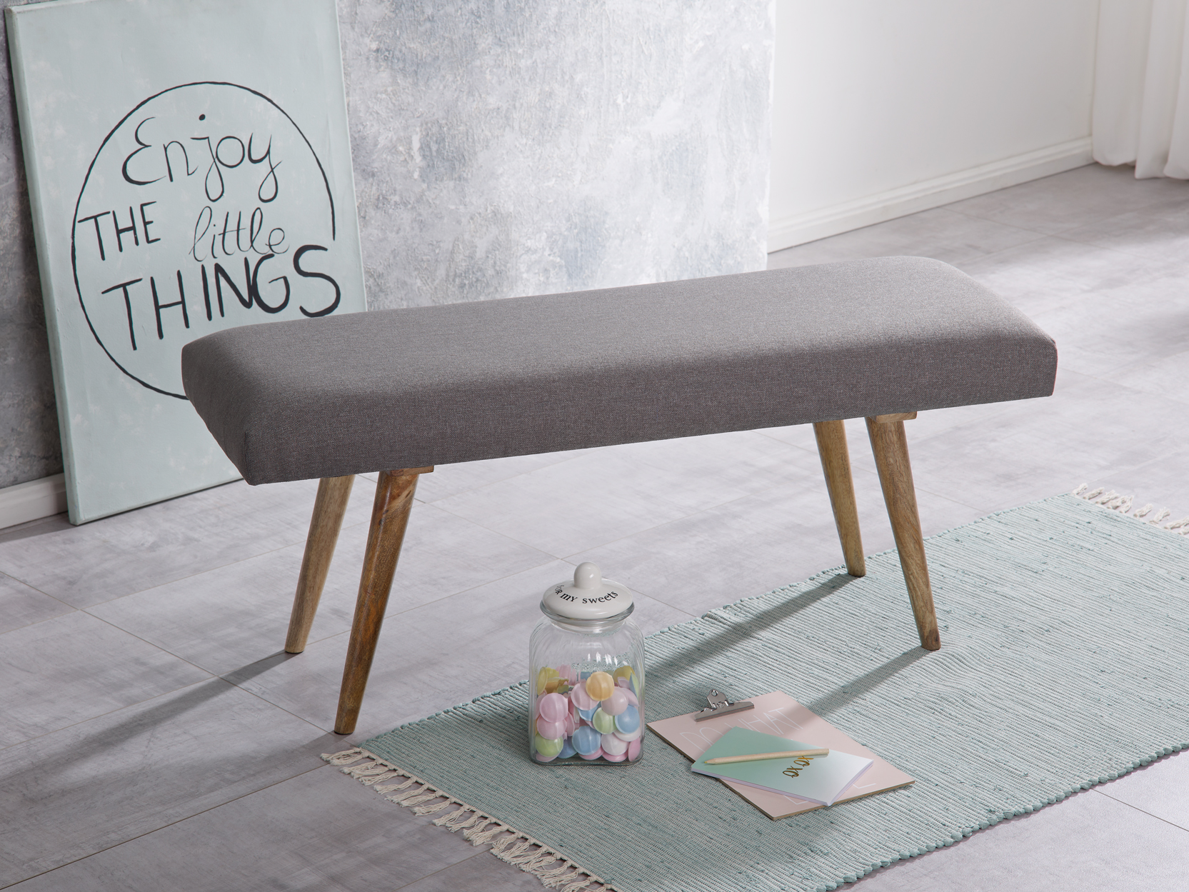 Lavice v moderním retro stylu s elegantním šedým látkovým potahem a masivním mangovým dřevem pro pohodlí a odolnost. Měkké polstrování zajišťuje komfortní sezení, robustní nohy stabilitu. Vhodná do úzkých prostor jako předsíně či jídelny.