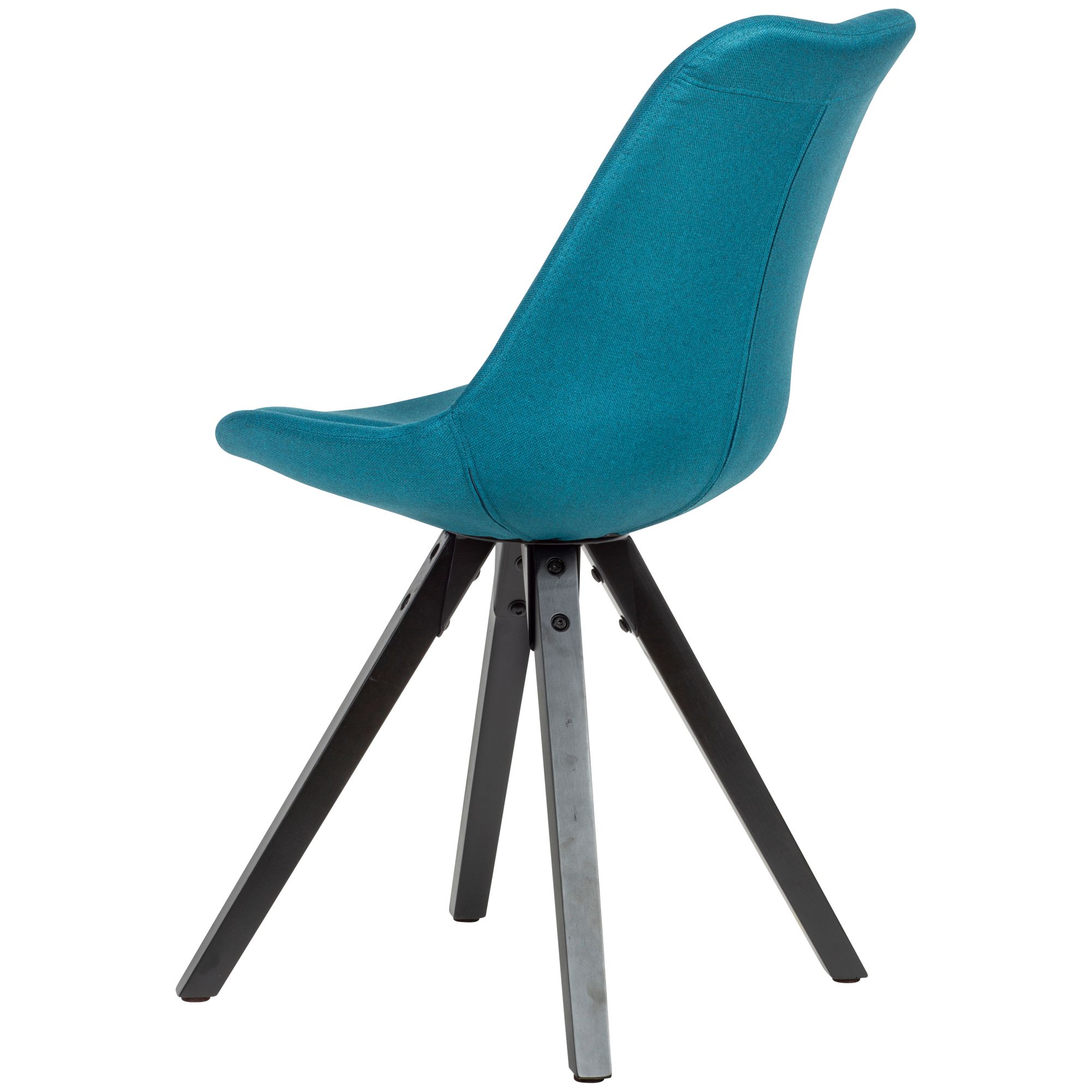 Objevte tento set 2 jídelních židlí v moderním skandinávském designu s elegantním petrolejově modrým látkovým čalouněním. Sedák obsahuje pevně připevněný polštář pro delší pohodlí při sezení. Nožky z masivního dřeva Hevea, černě lakované, zajišťují stabilitu a odolnost. Filcové kluzáky pod nohami chrání podlahu před poškrábáním a tlumí zvuky.