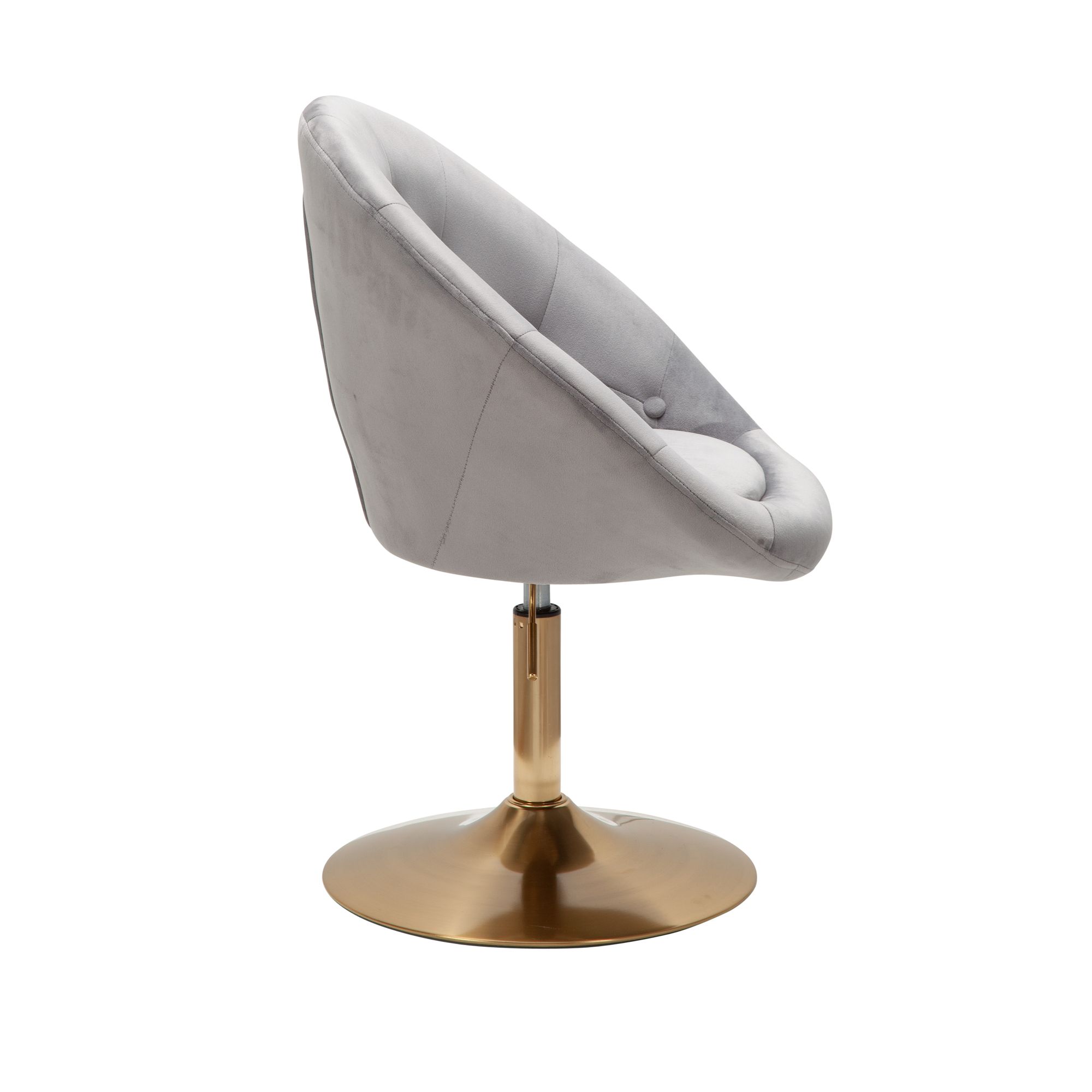Užijte si pohodlí s tímto elegantním lounge křeslem z šedého sametu se zlatou základnou ve tvaru trumpety. Otáčivý design o 360° poskytuje vynikající mobilitu, ideální pro obývací pokoje nebo kanceláře.