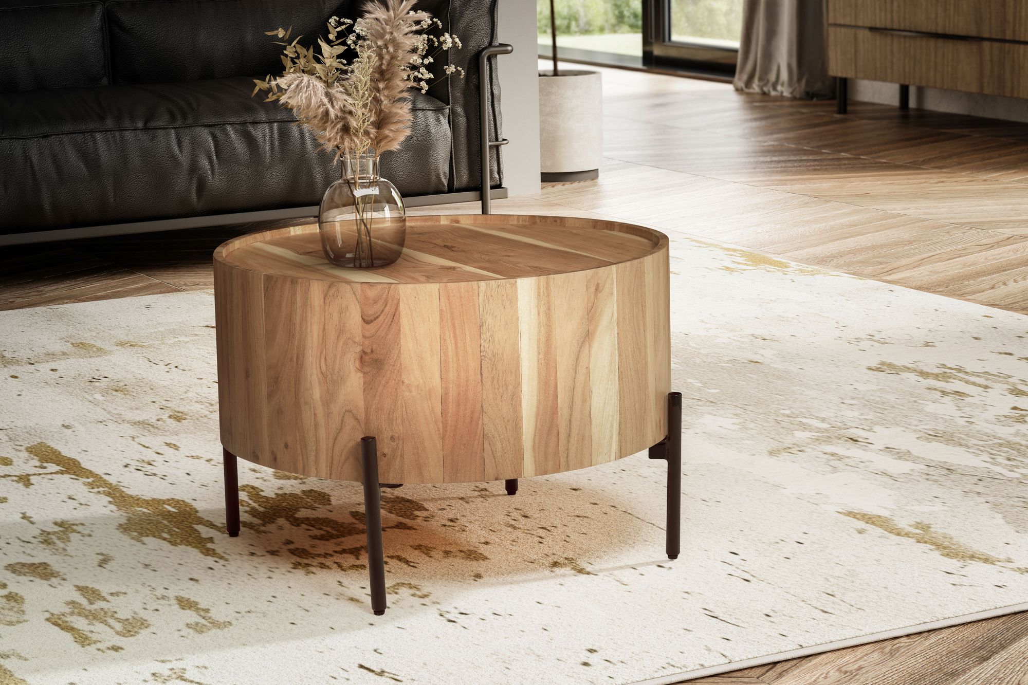Přidejte do svého obývacího pokoje přírodní a moderní prvek s tímto kulatým konferenčním stolkem z masivního akácie a černým kovovým rámem. Jeho čistý design spojuje odolnost s vizuální lehkostí.