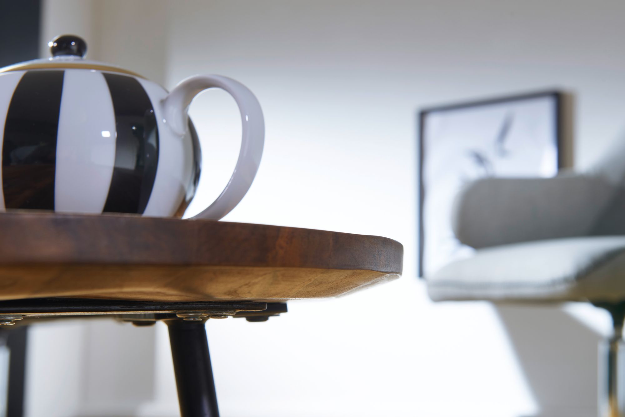 Tento konferenční stolek v retro designu je vyroben z masivního dřeva Sheesham, spojující odolnost a eleganci. Typický tvar desky stolku v podobě ledviny z 50. let a černé kovové nohy mu dodávají jedinečný styl.