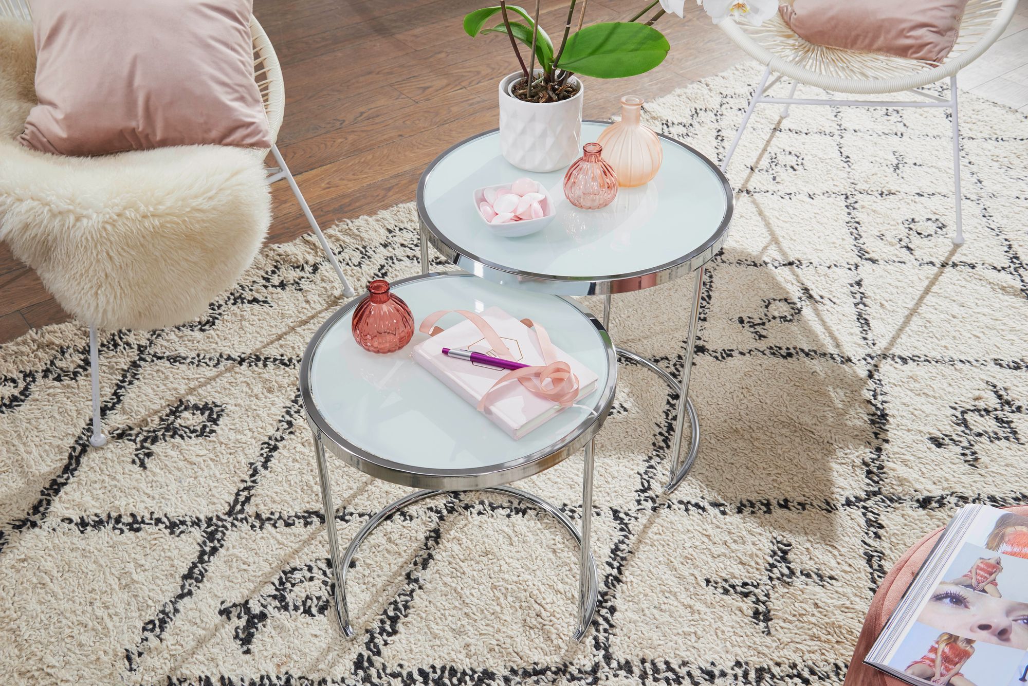 Tato dvoudílná sada kulatých odkládacích stolků vyniká moderním designem a elegantní bílostříbrnou barevnou kombinací. Matné skleněné desky leží na chromovaných ocelových rámech, které dodávají eleganci a lehkost jakémukoli prostoru.