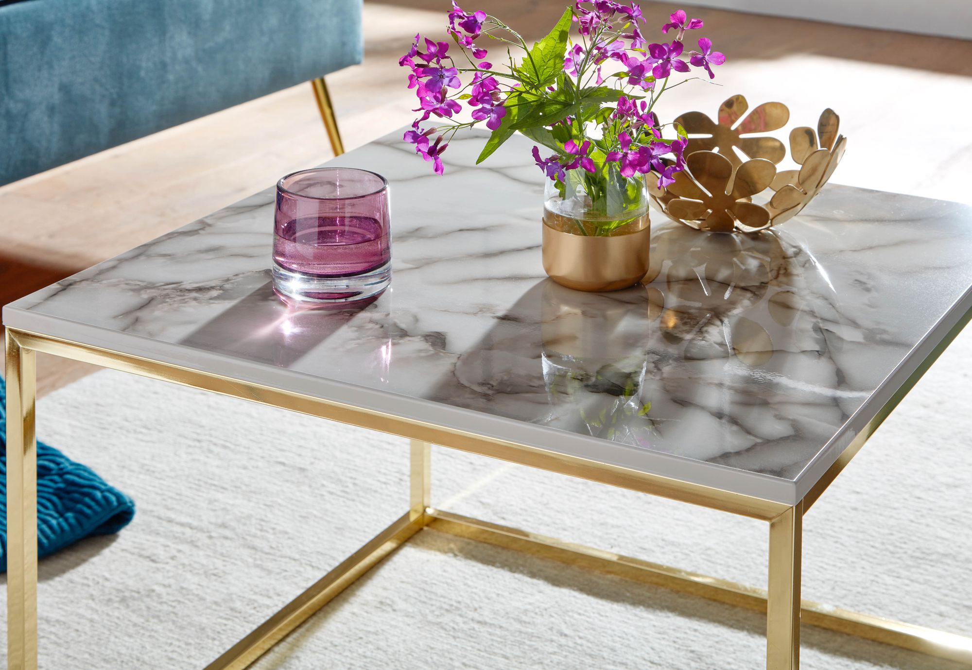 Konferenční stolek 60x60x45 cm | Deska s bílým mramorovým efektem | Zlatý kovový rám