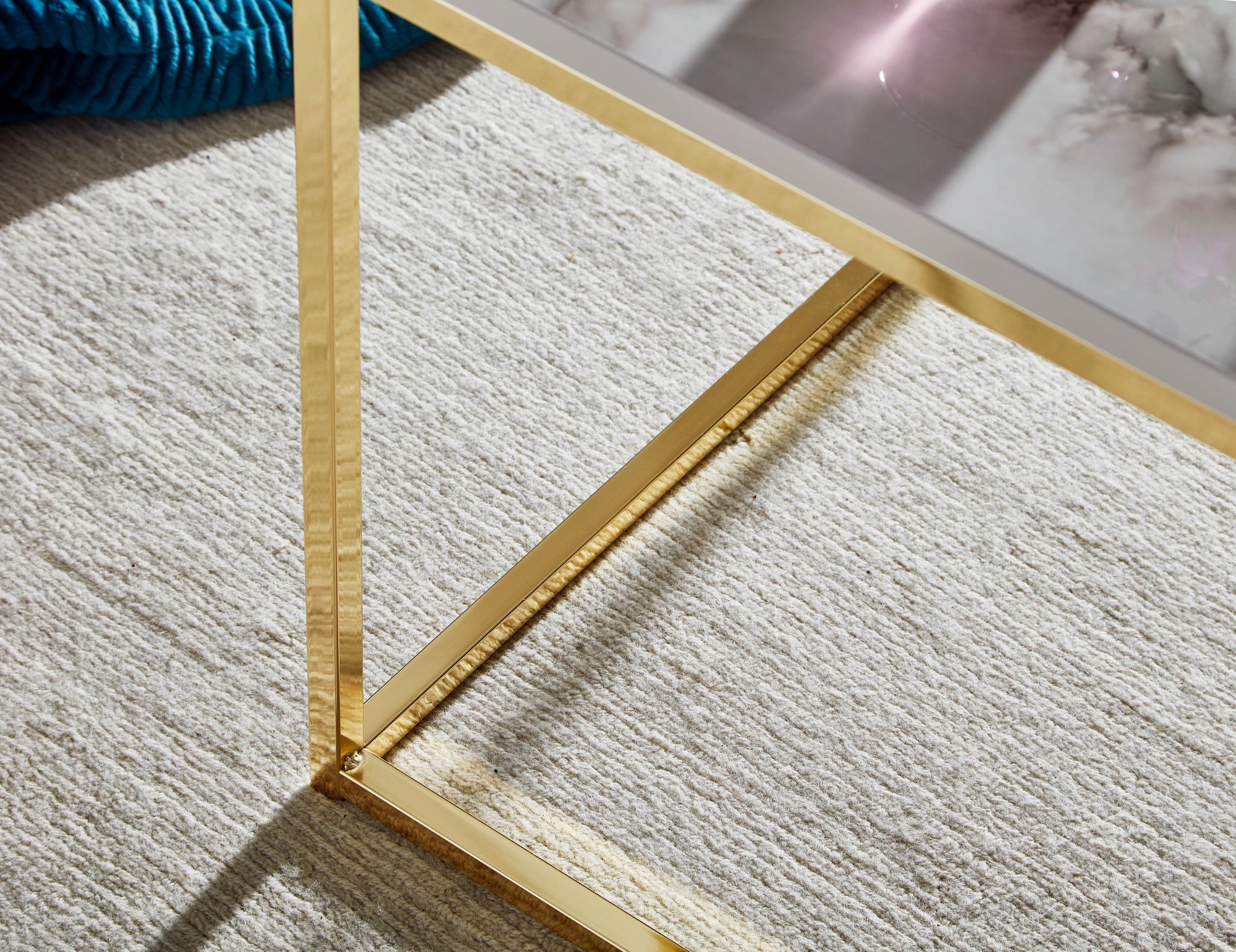Vneste do svého obývacího pokoje moderní a elegantní atmosféru s tímto čtvercovým konferenčním stolkem o rozměrech 60x60x45 cm. Deska z foliovaného MDF s vrstvou polyresinu v lesklém bílém mramorovém dekoru nabízí kvalitní a odolný povrch. Konstrukce z lakované oceli v lesklé zlaté barvě zajišťuje stabilitu a stylový vzhled.
