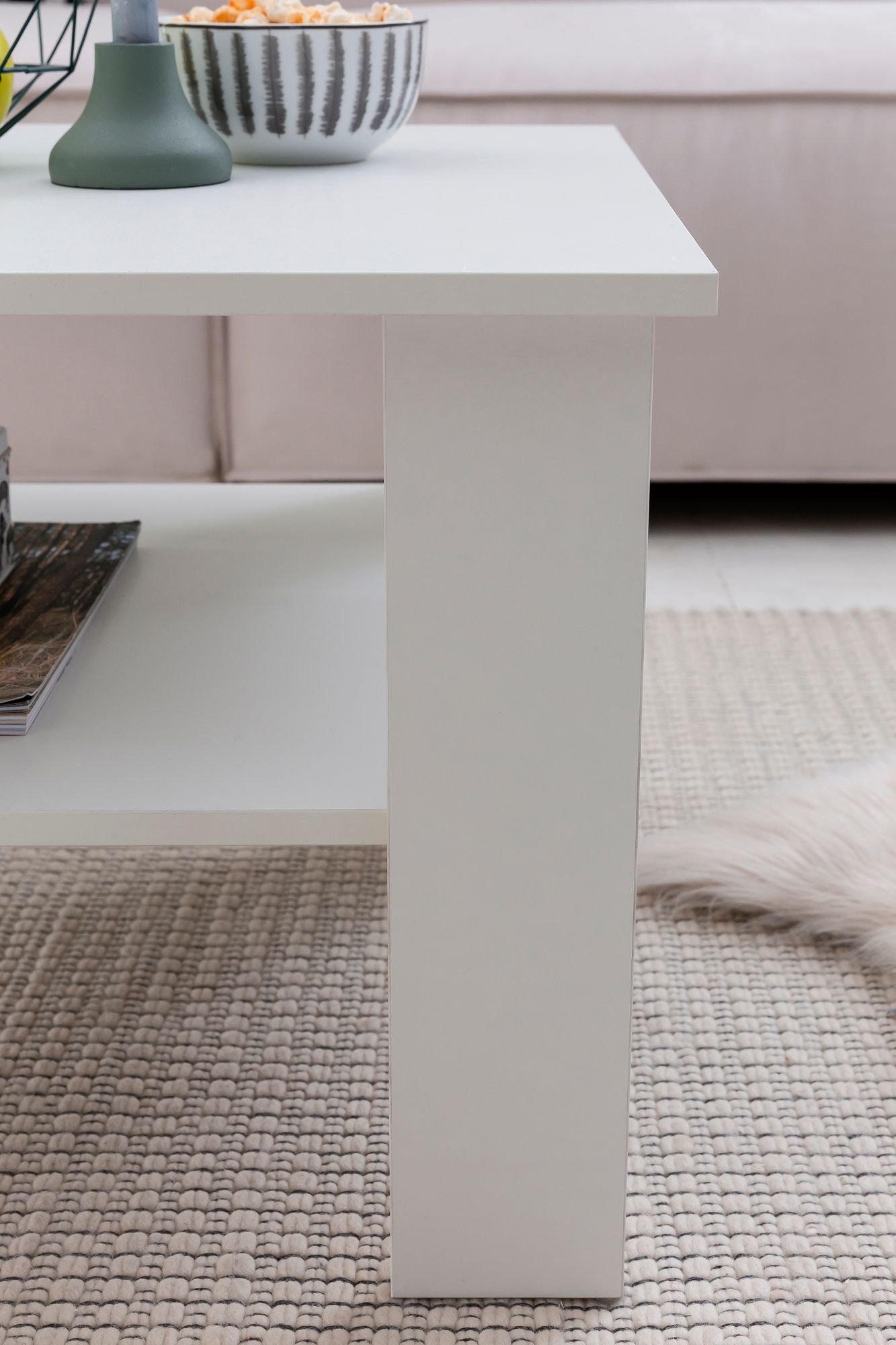 Tento bílý konferenční stolek spojuje jednoduchý design s praktickou funkčností. Díky polici pod deskou optimalizuje úložný prostor ve vašem obývacím pokoji.
