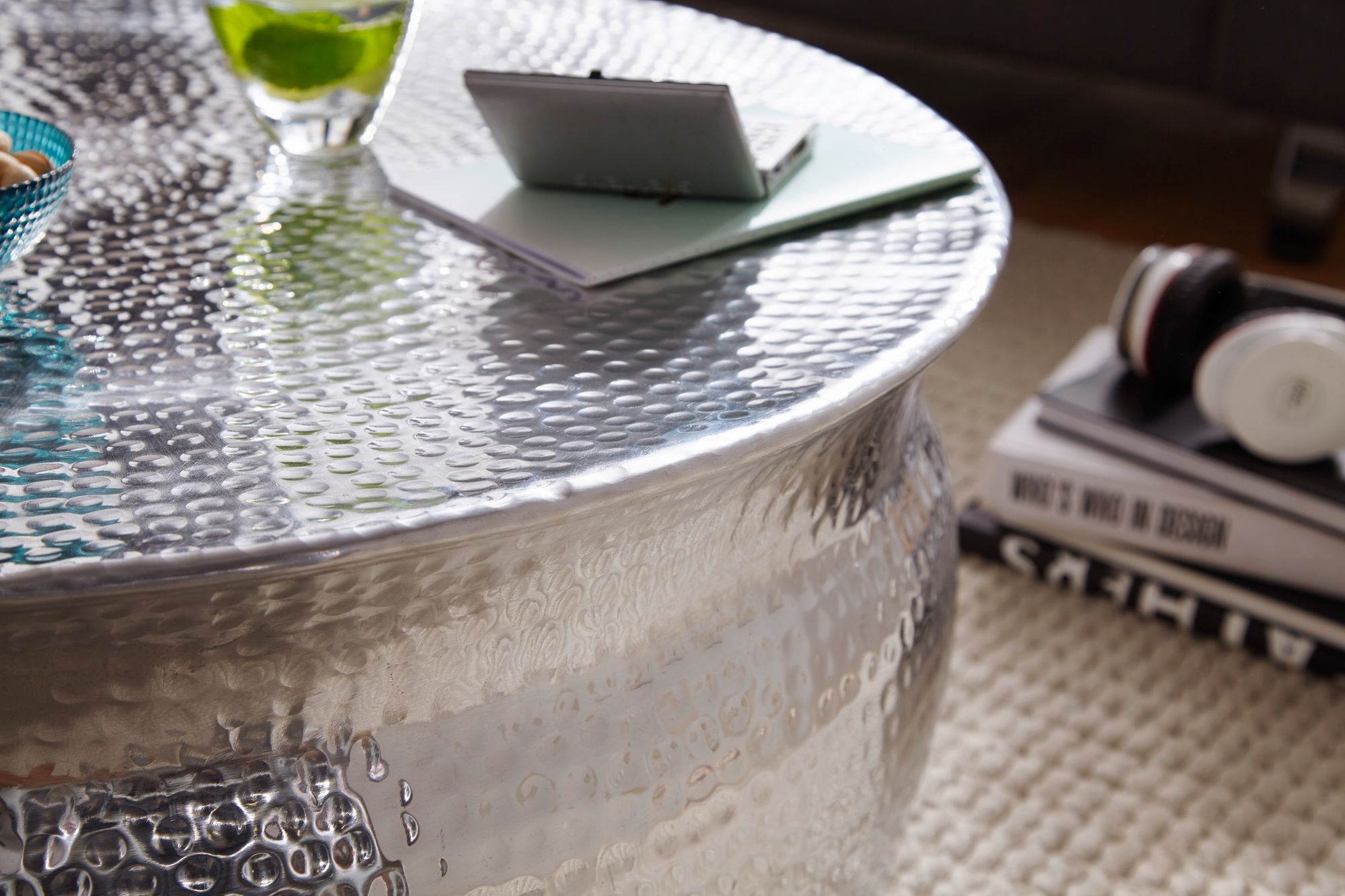Přidejte do svého obývacího pokoje exotický dotek s tímto konferenčním stolkem z hliníku s jedinečným orientálním designem. Jeho stříbrná povrchová úprava a krásná plochá kladívková struktura z něj činí funkční a dekorativní prvek, ideální pro ovladače, časopisy nebo nápoje.