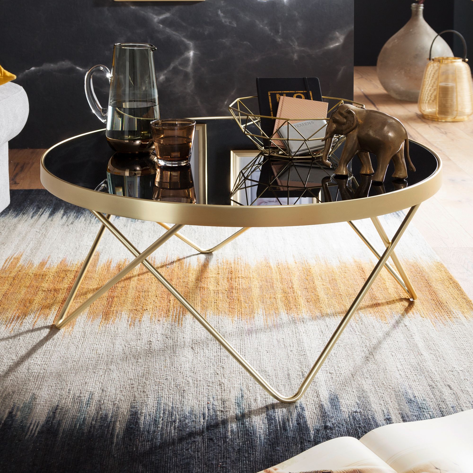 Vneste do svého obývacího pokoje moderní retro eleganci s tímto konferenčním stolkem o průměru 82 cm, který kombinuje kov a černé sklo. Pozlacený lakovaný ocelový rám s odolnou skleněnou deskou z bezpečnostního skla nabízí styl a trvanlivost.