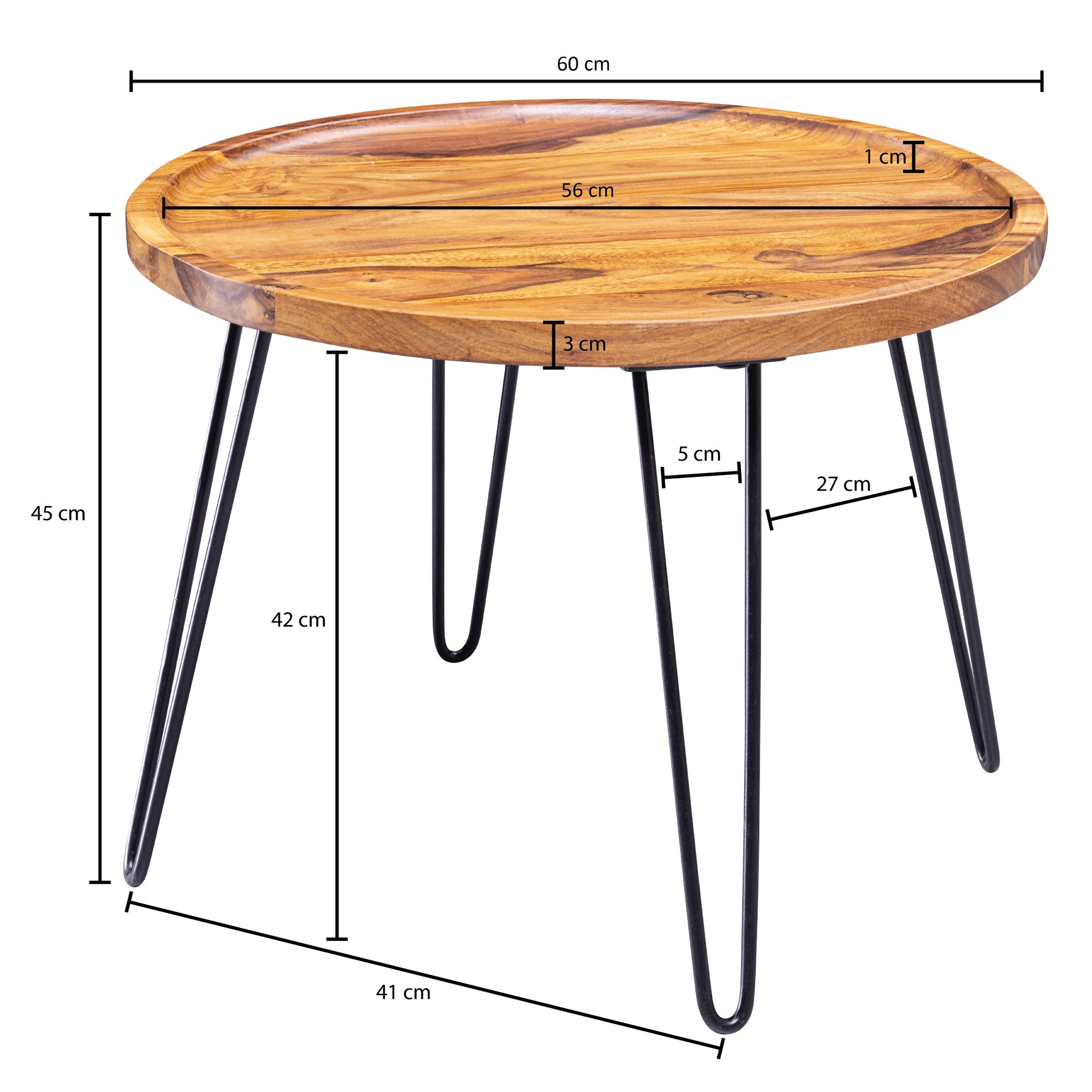Tento kulatý konferenční stolek z masivního dřeva Sheesham kombinuje přírodní eleganci s industriálním stylem díky černým kovovým nohám ve tvaru jehlic. Prostorná plocha s průměrem 60 cm nabízí ideální místo pro nápoje, občerstvení a ovladače, zvýrazněnou krásnou strukturou dřeva.