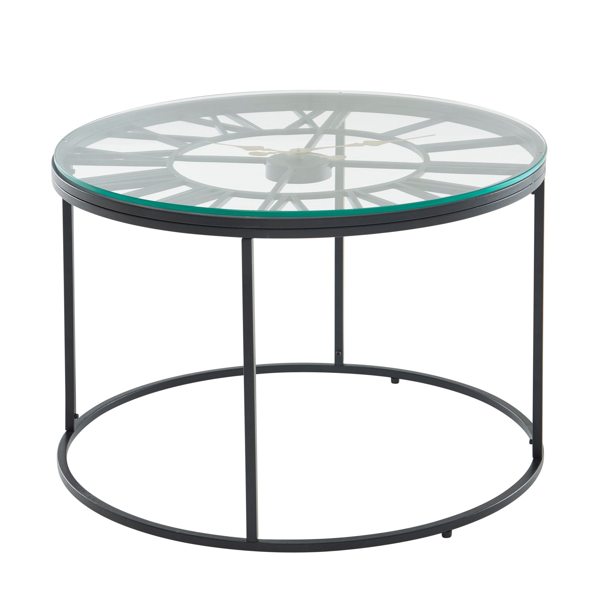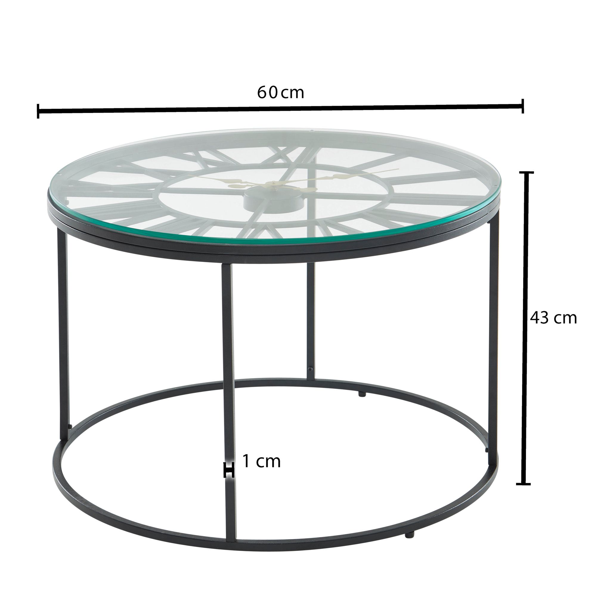 Tento kulatý konferenční stolek má průhlednou skleněnou desku a černý kovový rám, spojující moderní design s funkčností. Obsahuje dekorativní hodiny s římskými číslicemi, které dodají obývacímu pokoji originální vzhled. Robustní konstrukce snese až 20 kg a protiskluzové nožičky chrání podlahu.