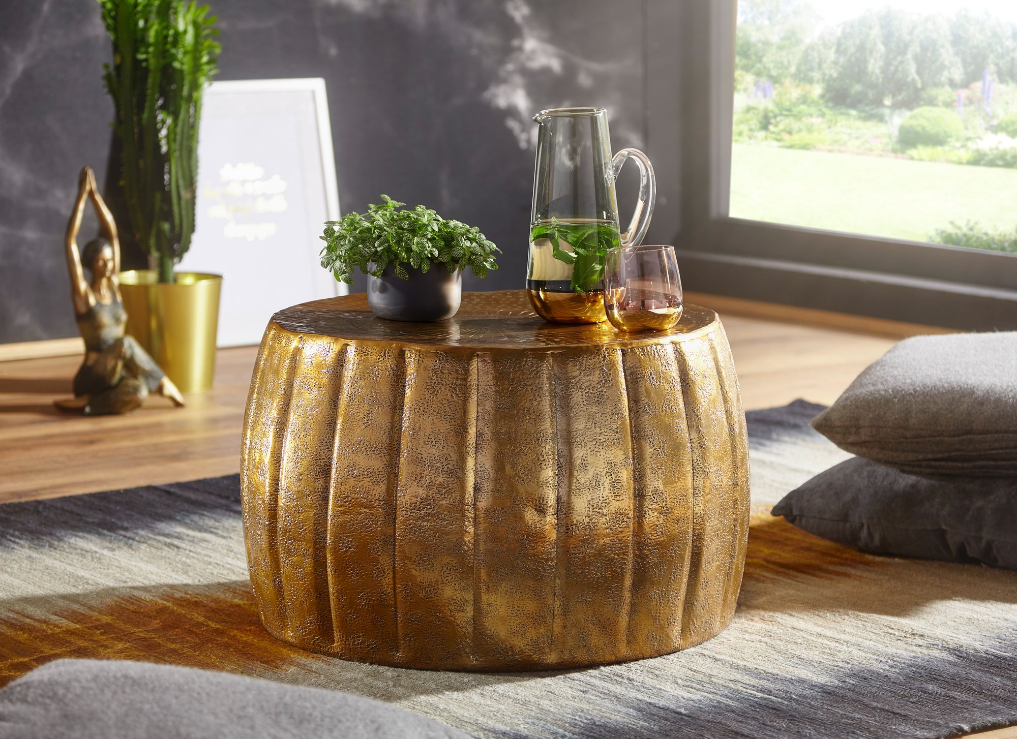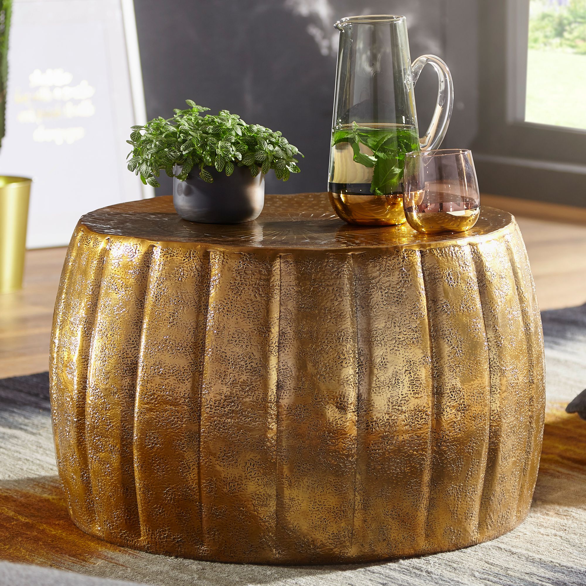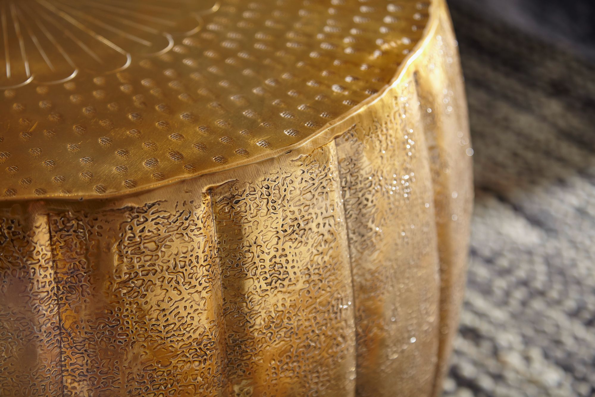 Informace o výrobku "Konferenční stolek z hliníku zlatý orientální | 60x36x60 cm | Kulatý design s kladívkovanou plochou a dekorativním motivem"