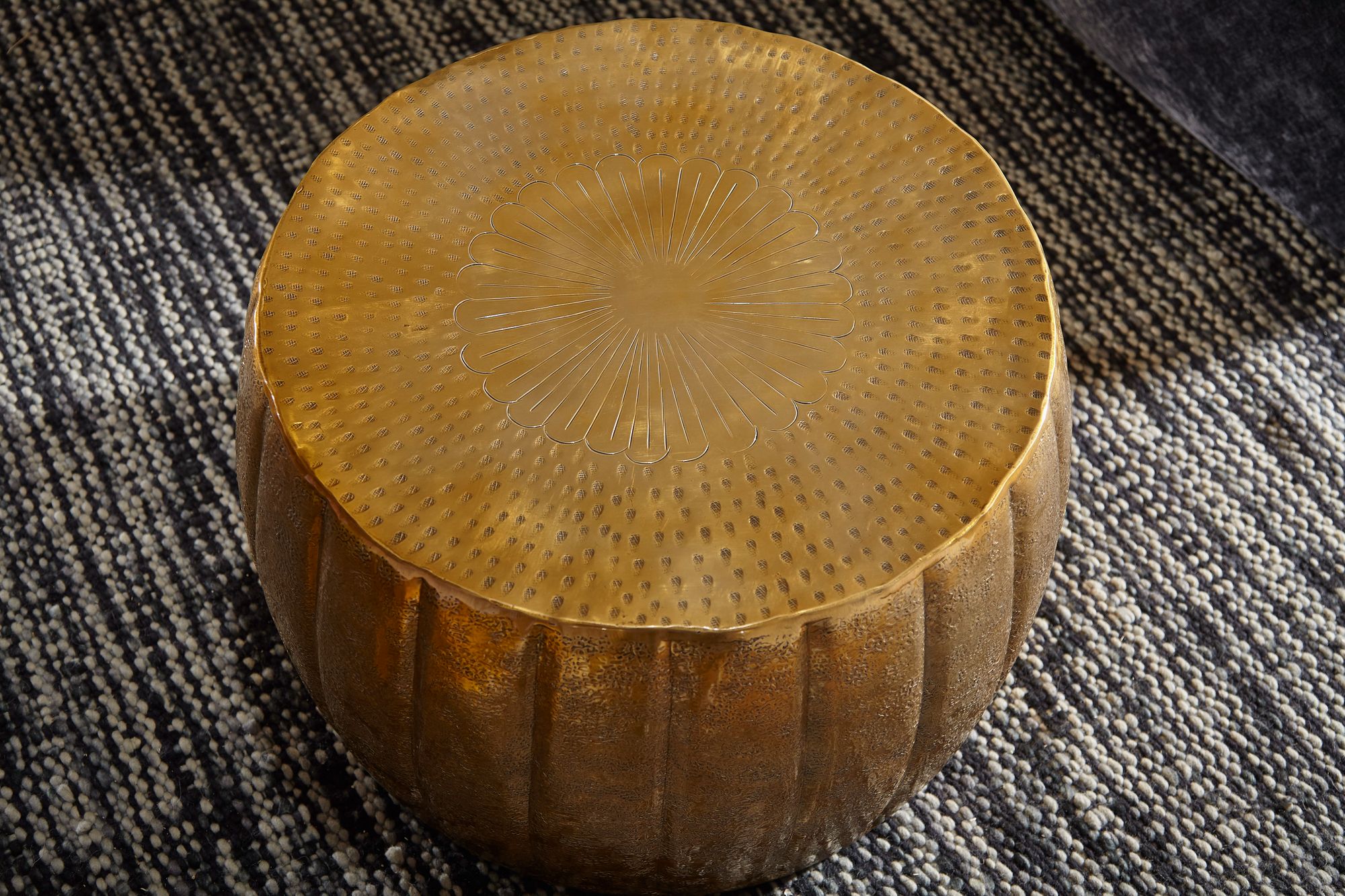 Přidejte orientální elegantní prvek s tímto zlatým konferenčním stolkem z hliníku o rozměrech 60x36x60 cm. Jeho kulatá plocha s kladívkovanou povrchovou úpravou obsahuje zdobený motiv. Každý kus je ručně vyroben, což zajišťuje jedinečnost a kvalitu. Hliník poskytuje lehkost a odolnost.
