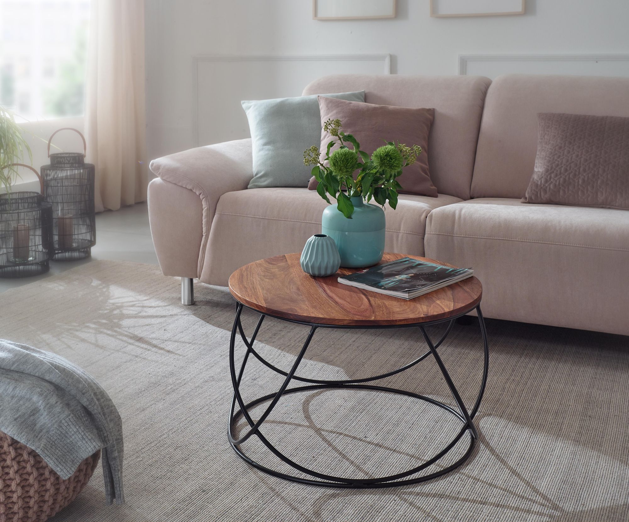 Informace o výrobku "Konferenční stolek z masivního dřeva Sheesham hnědý 60x40x60 cm | Industriální kulatý design s kovovým rámem"