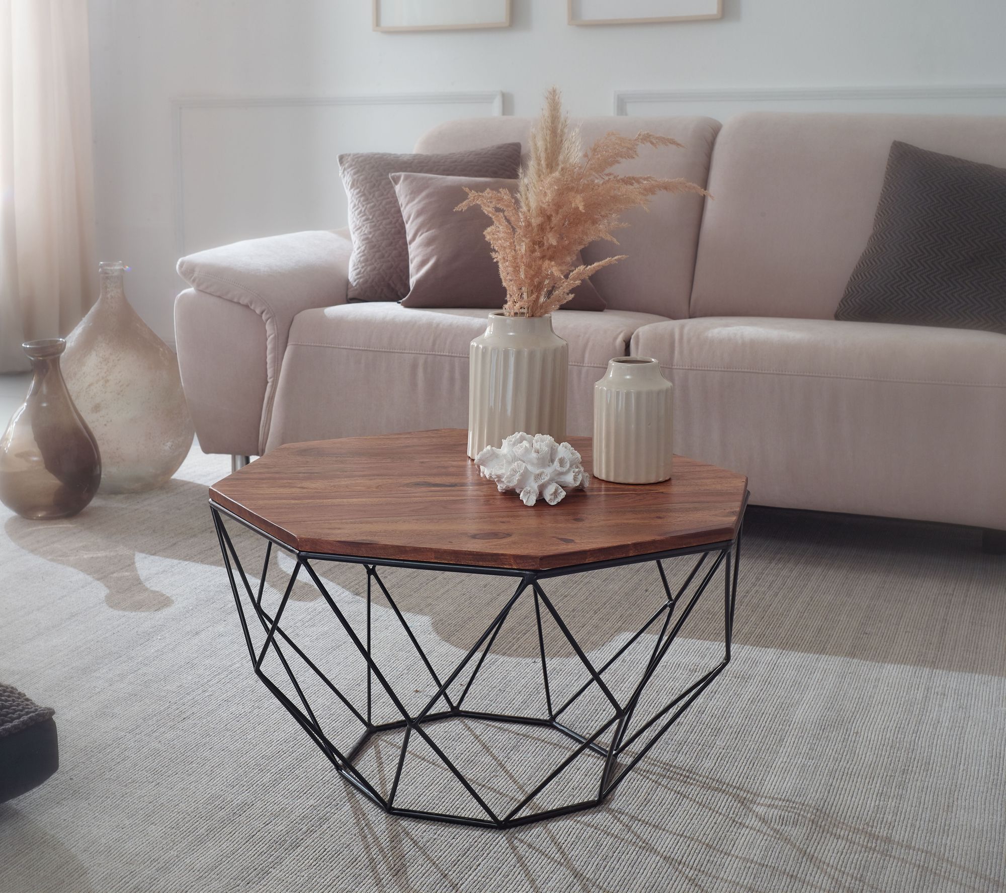 Nápadný konferenční stolek z masivního dřeva Sheesham, rozměry 66x40x66 cm, vhodný do industriálního interiéru. Osmiboká deska skýtá stylový a praktický povrch pro různé účely.