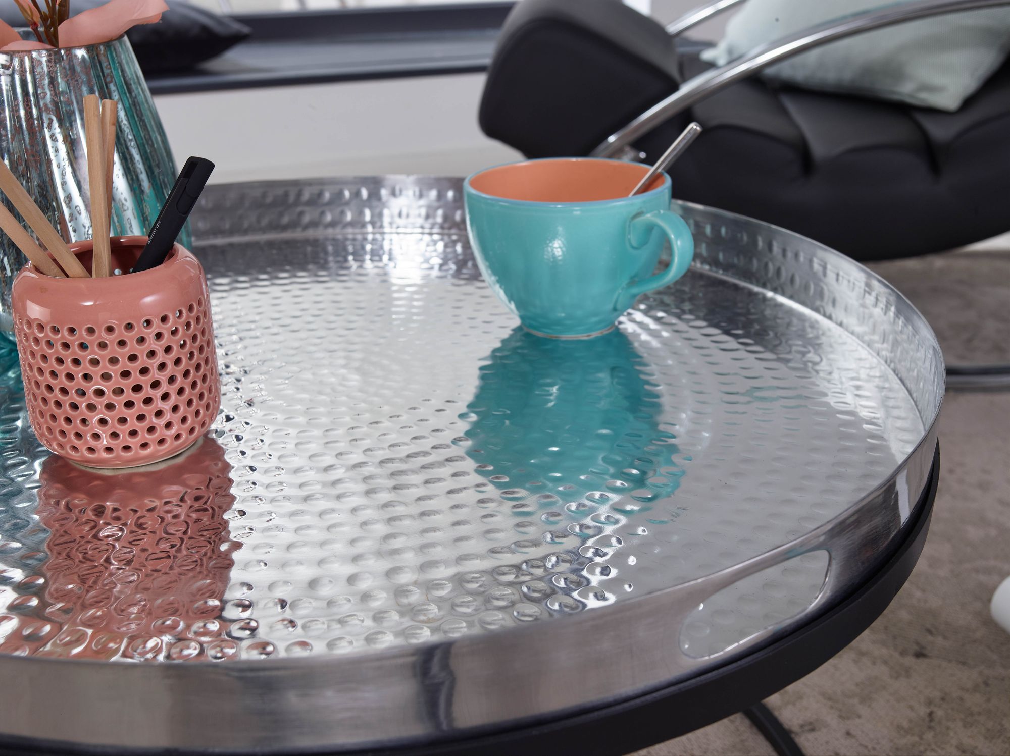 Užijte si spojení stylu a praktičnosti s tímto kulatým konferenčním stolkem z kladívkovaného hliníku ve stříbrné a černé barvě. Odnímatelný podnos s úchyty usnadňuje přesun a čištění.