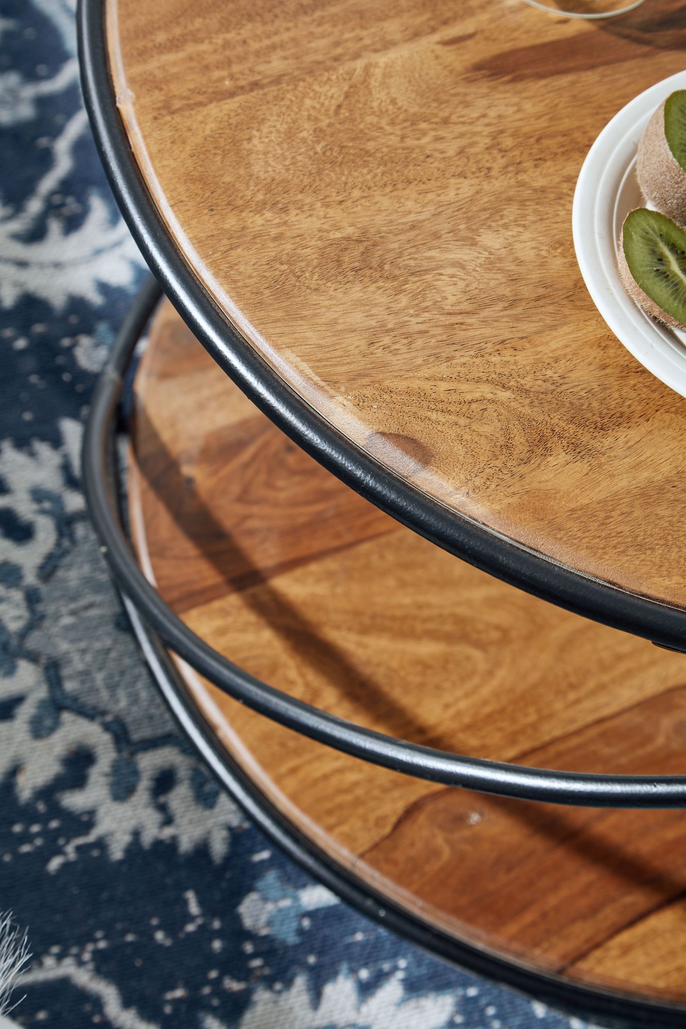 Tento kulatý konferenční stolek z masivního Sheesham dřeva a kovu spojuje odolnost s elegancí do moderního obývacího pokoje. Design s neobvyklým podnožím a dvěma policemi s tmavým dřevem a průhledným lakem zajišťuje praktické použití a stylový vzhled.