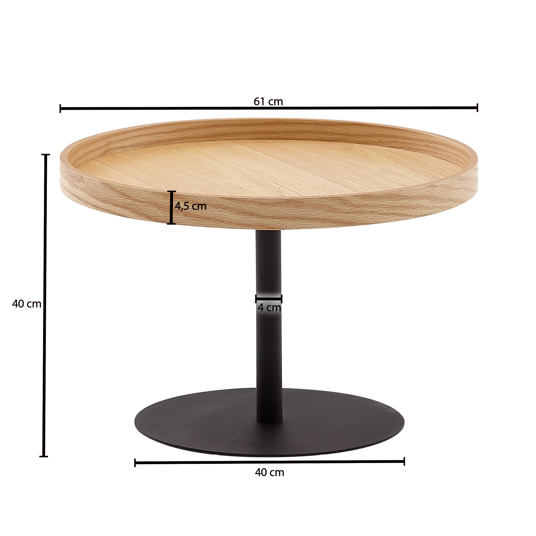 Zvolte moderní vzhled s tímto kulatým konferenčním stolkem, který má desku MDF s dubovou dýhou v hnědé barvě a pevný, matně černý ocelový rám. Vrchní deska o tloušťce 1,5 cm obsahuje zvýšený okraj, který chrání předměty před sklouznutím.