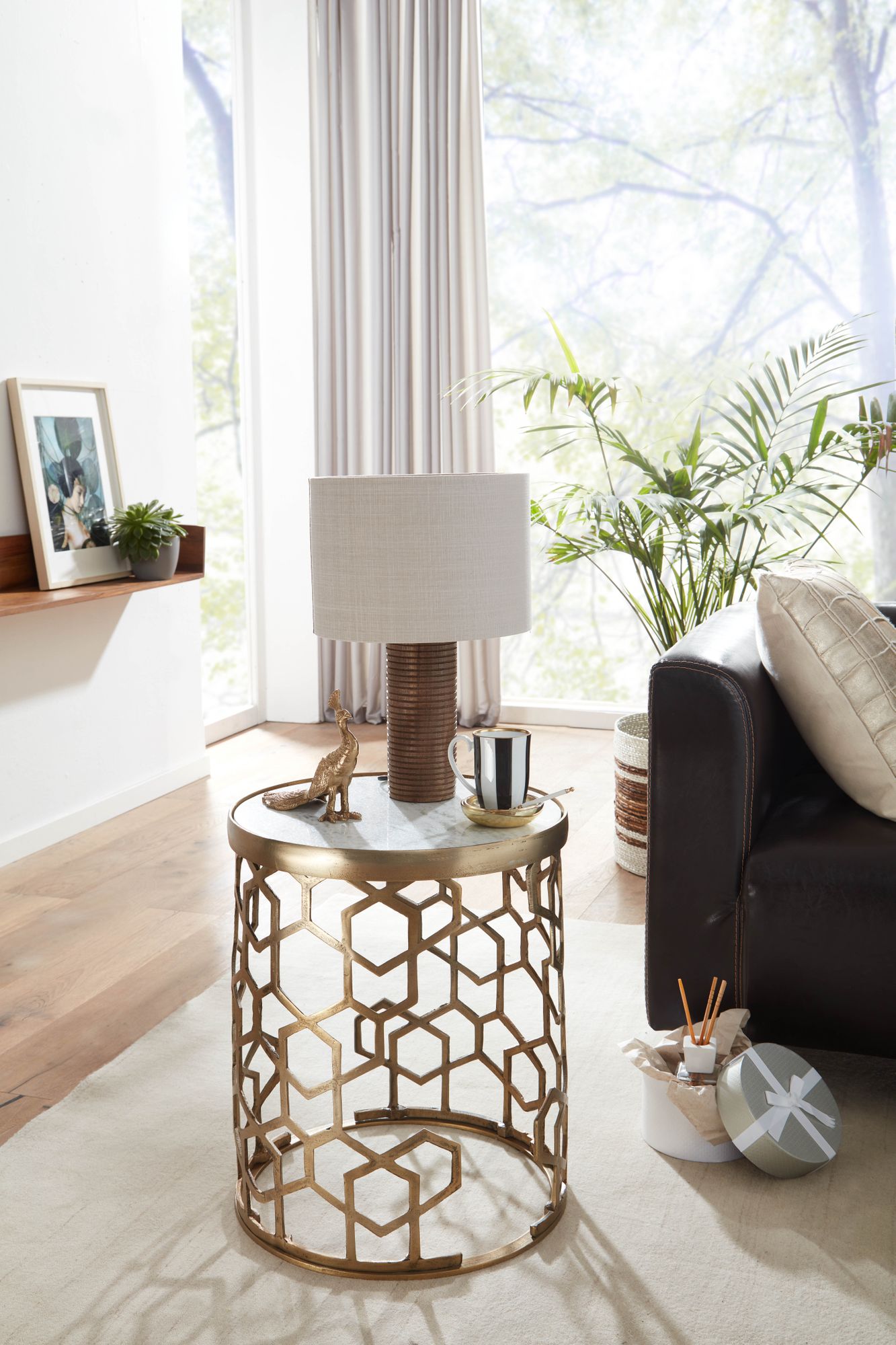 Přidejte do svého interiéru jedinečný kousek se stolem odkládacím kulatým z bílého mramoru a zlatého kovu v otevřeném, extravagantním designu. Ideální jako doplněk obývacích pokojů či ložnic.