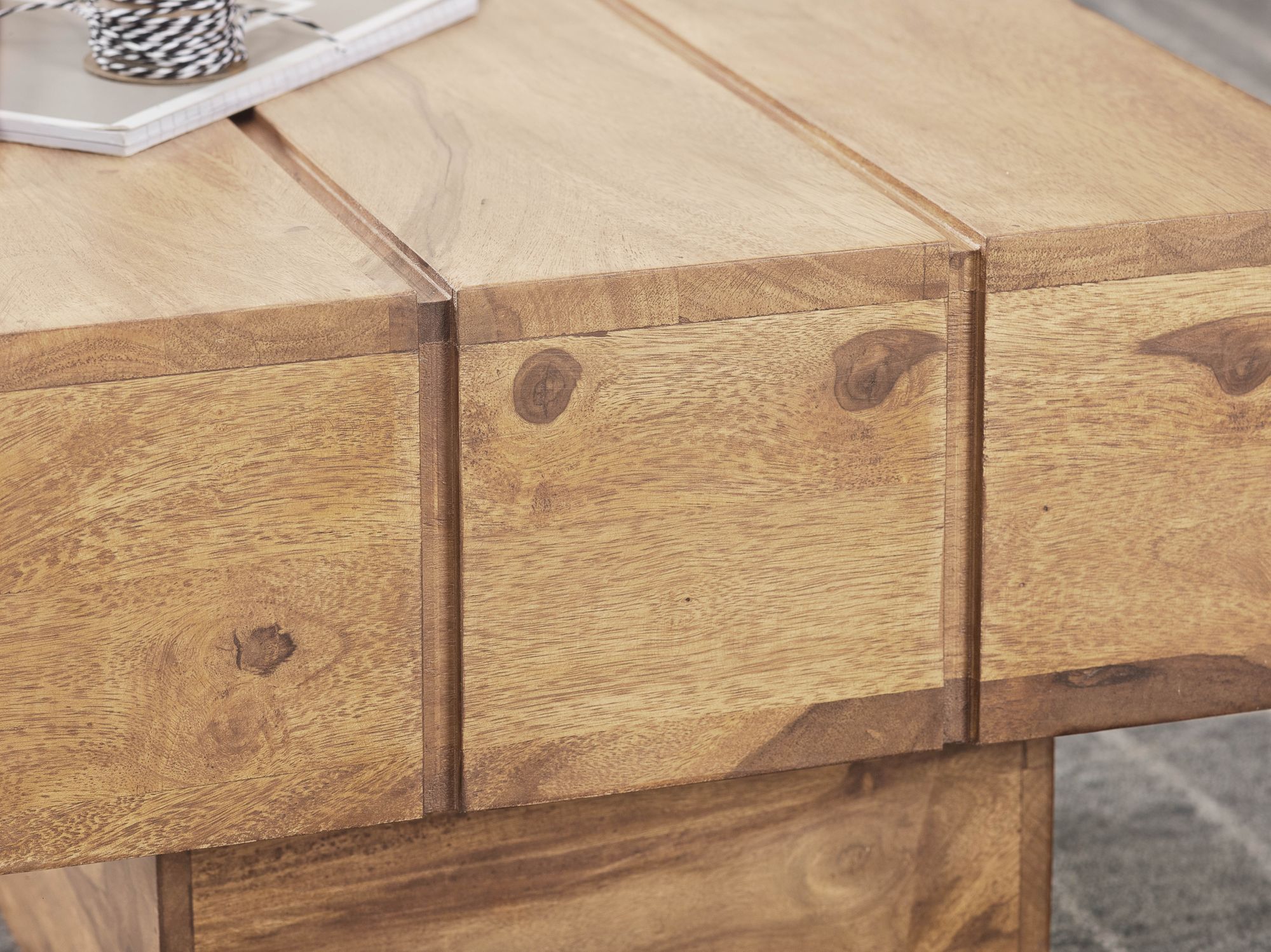 Přirozená kresba akáciového dřeva nabízí autentickou krásu a vysokou odolnost. Stolek stojí bezpečně na masivní čtvercové noze o rozměrech 28 x 28 cm.