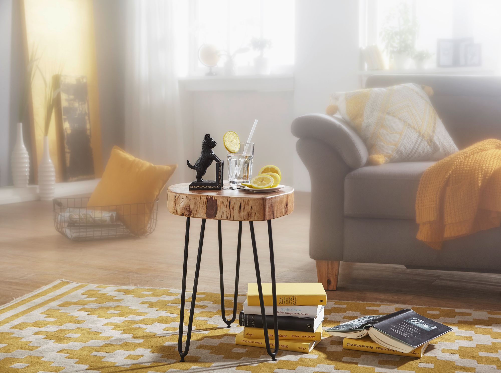 Vneste do vašeho domova přírodní eleganci s odkládacím stolkem BAGLI z masivního akáciového dřeva. Deska s přírodním okrajem a tři stylové kovové nohy spojují klasický design s moderní funkčností.