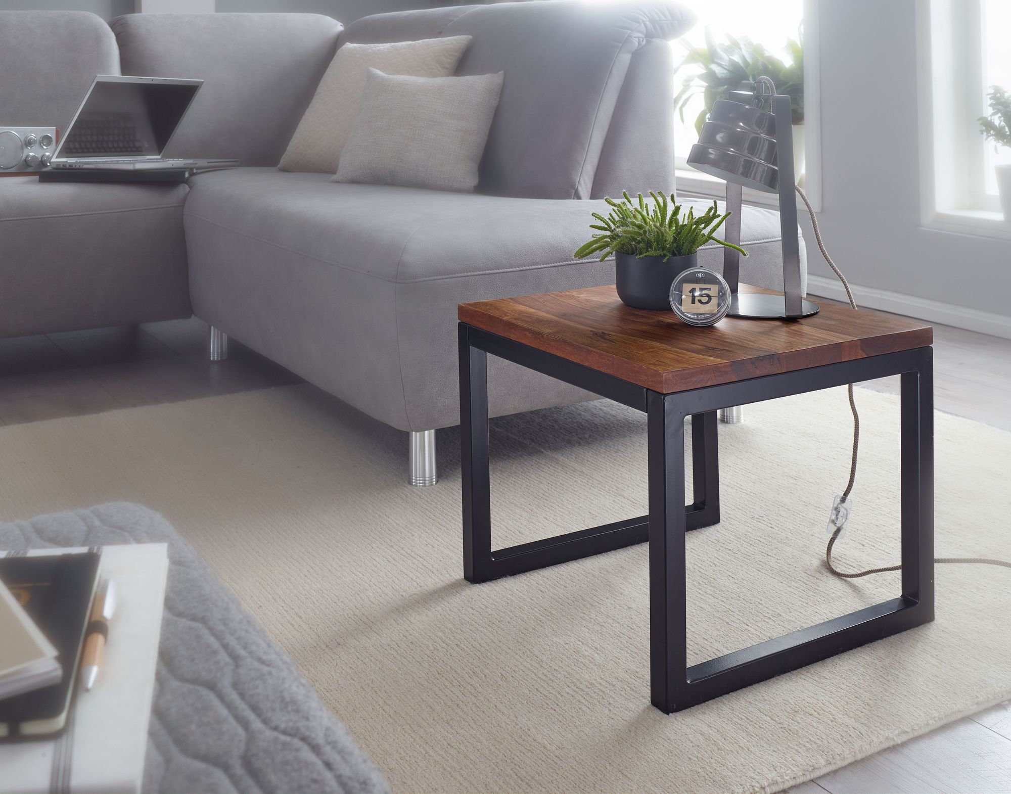 Vnesete do svého domova teplý industriální nádech s tímto odkládacím stolkem z masivního Sheesham dřeva a černého kovu. Velká pracovní plocha a pevné nohy spojují eleganci s funkčností.