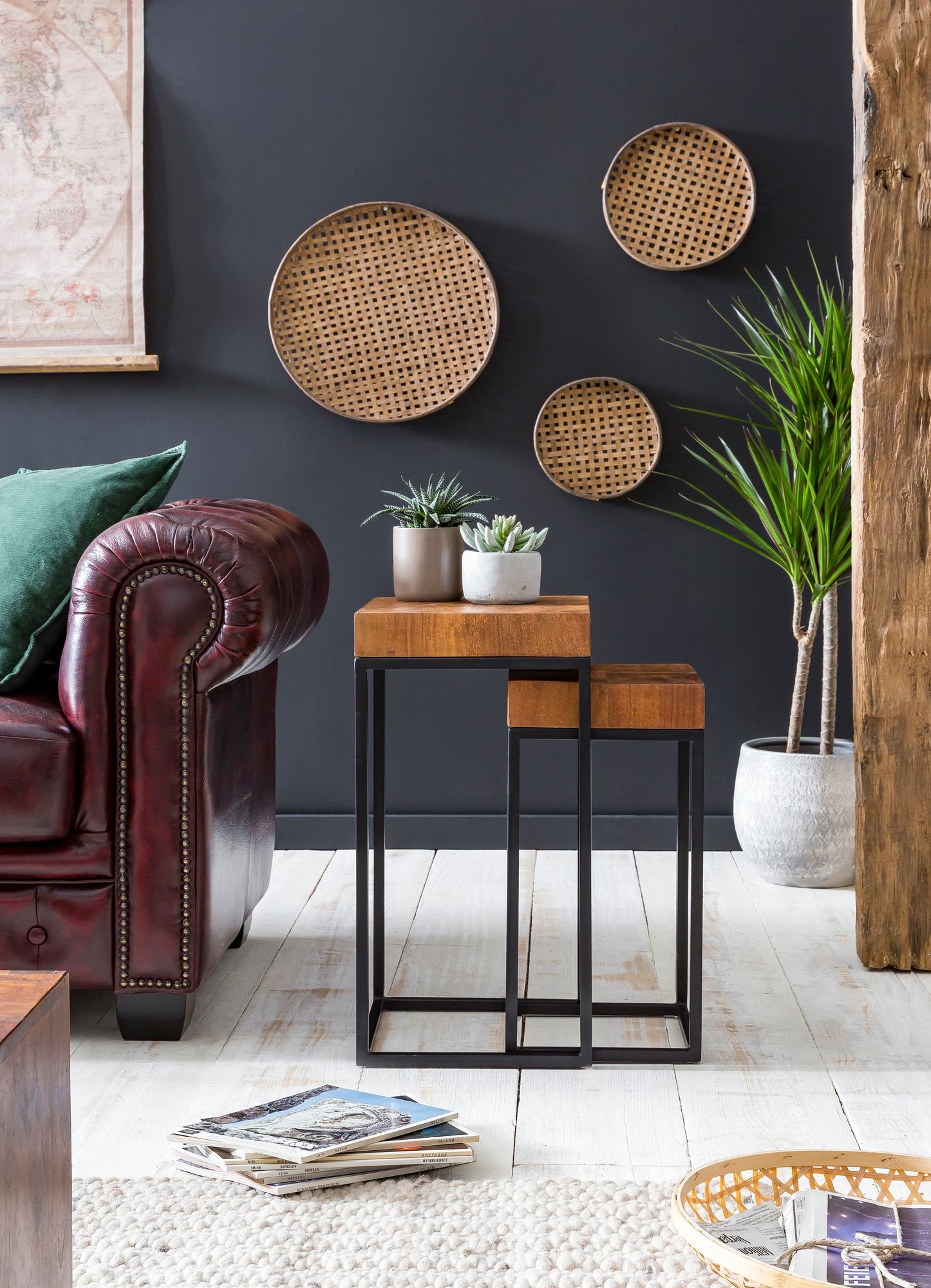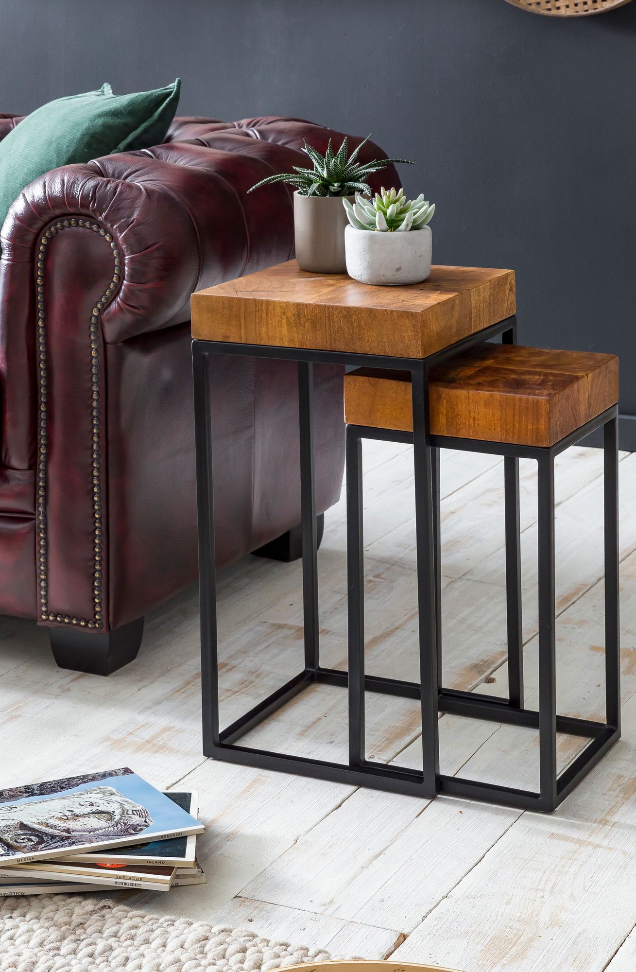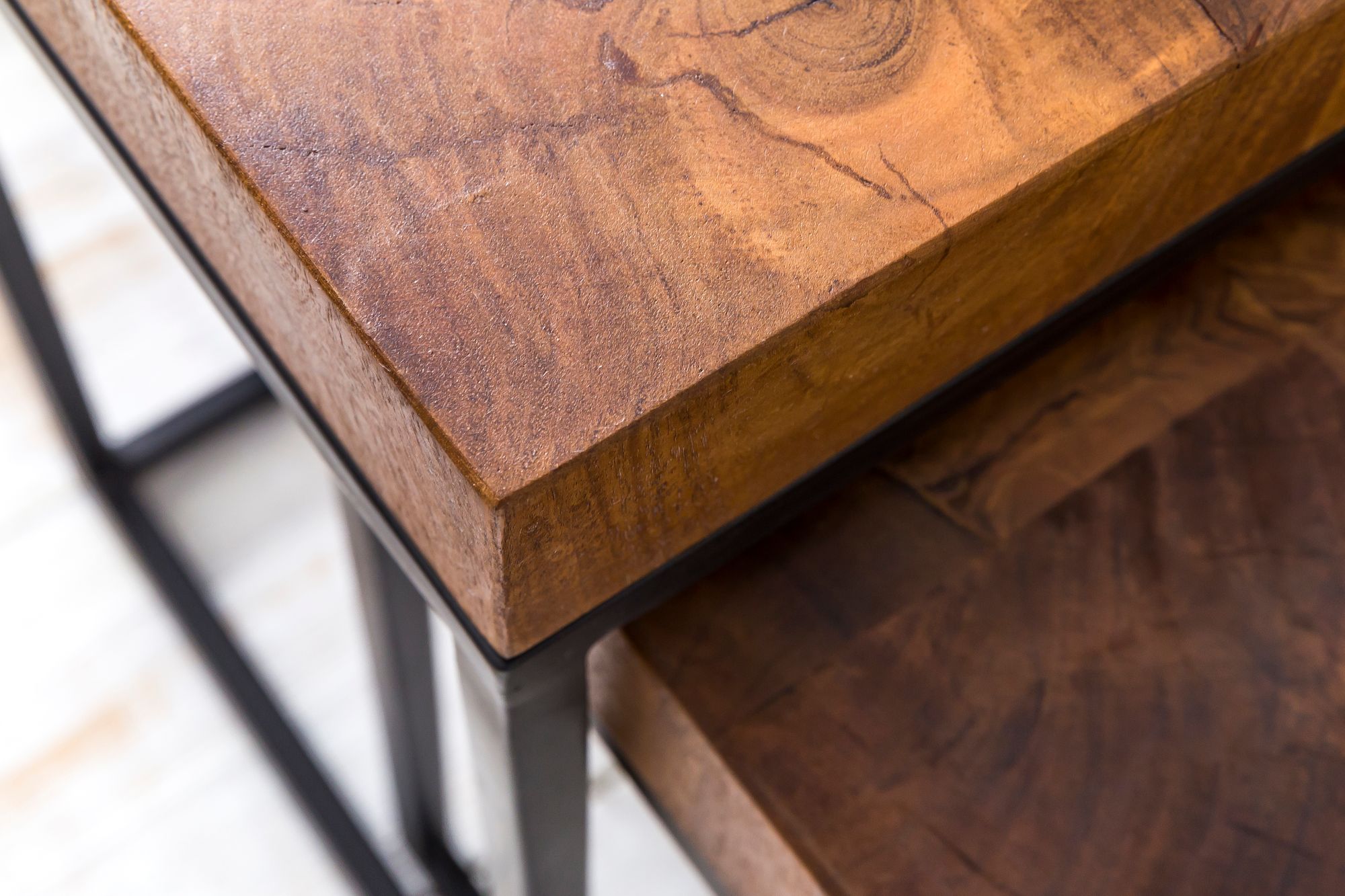 Přidejte elegantní industriální šarm do vašeho interiéru s touto sadou 2 bočních stolků z masivního Sheesham dřeva a černého matného kovu. Každý stůl je ručně vyrobený, díky čemuž je každý kus jedinečný díky přirozené struktuře dřeva.
