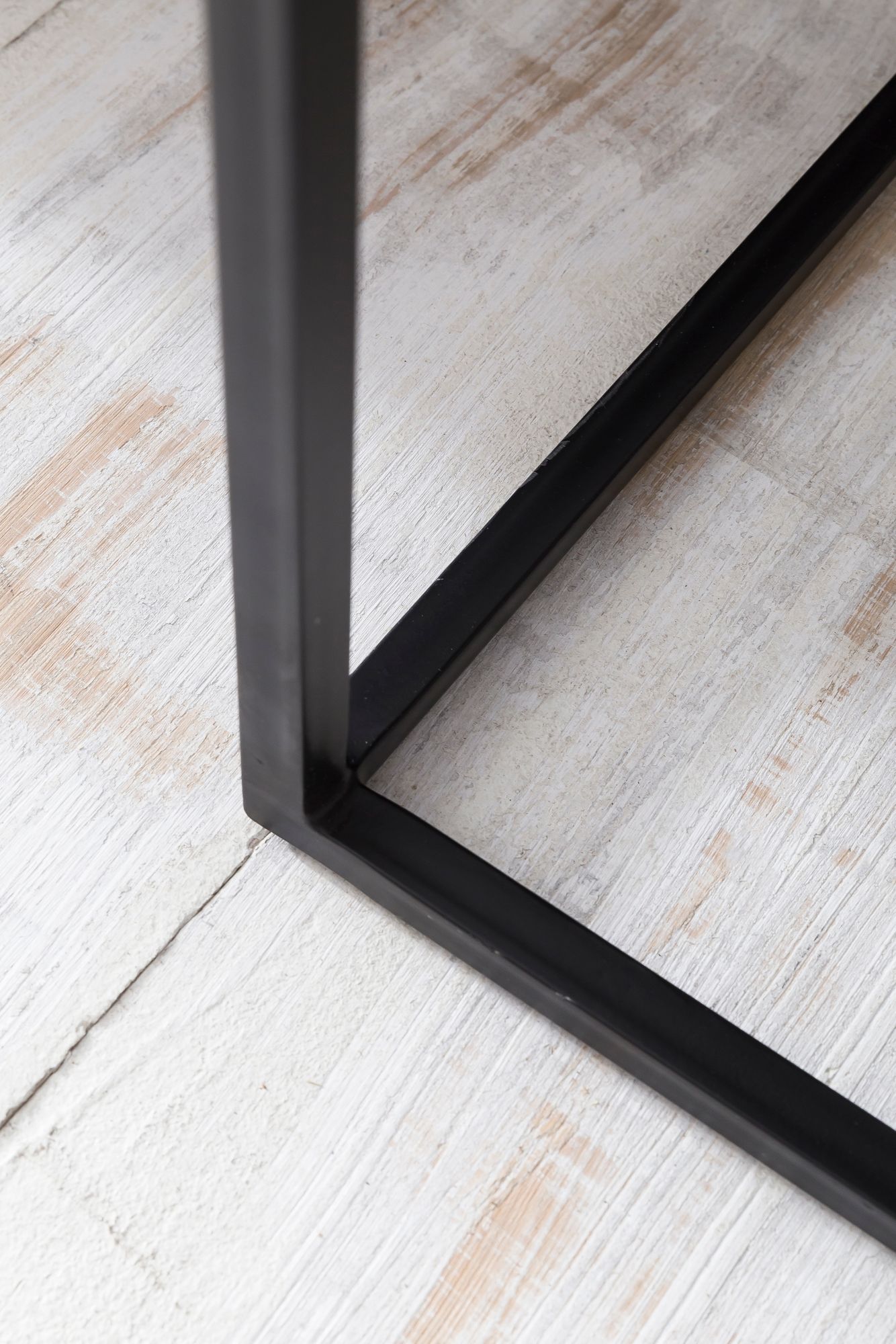 - Industriální design s kombinací masivního Sheesham dřeva a nohou z práškově lakované nerezové oceli v matné černé