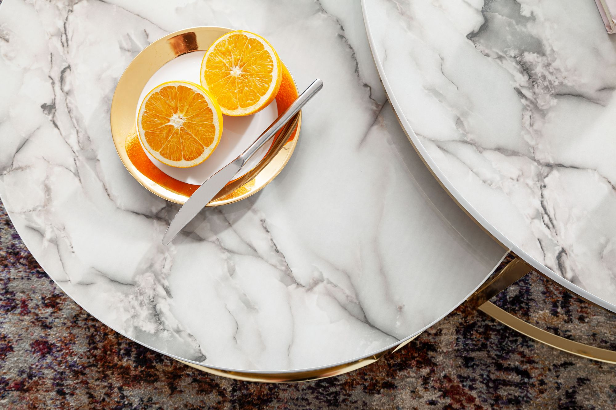 Sada 2 konferenčních stolků | Bílá a zlatá | Efekt mramoru | Rozměry 80x80x36 cm a 60x60x26 cm